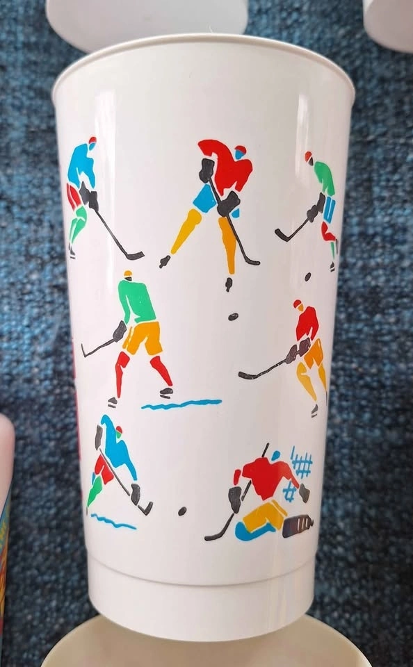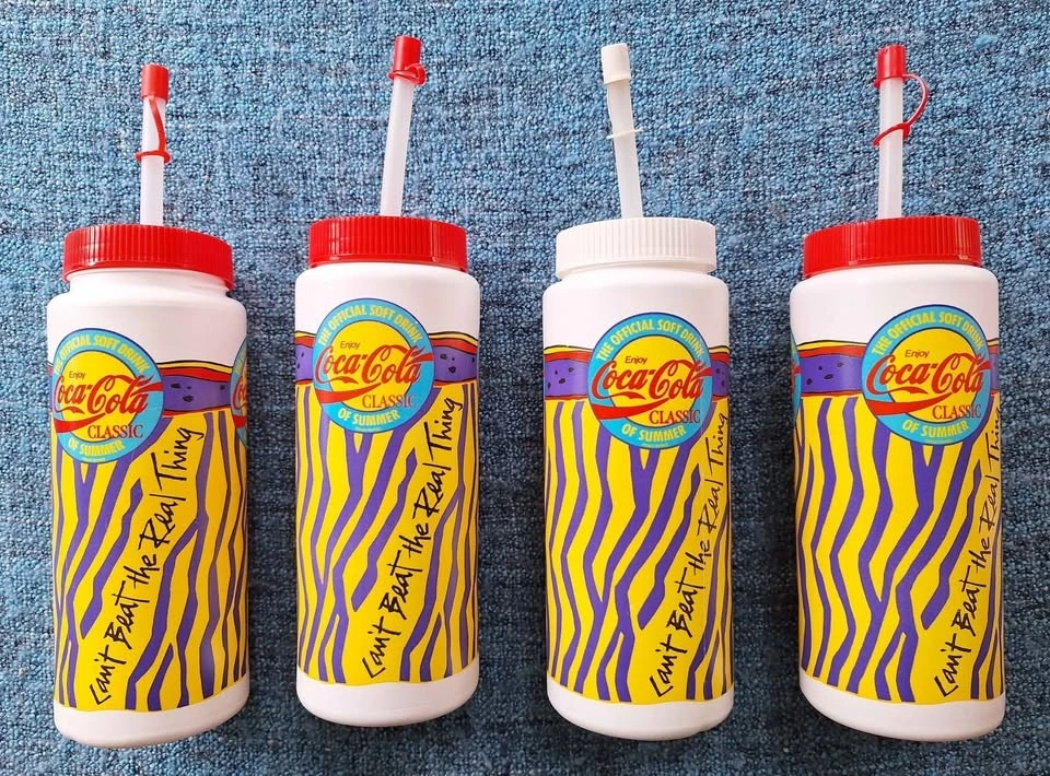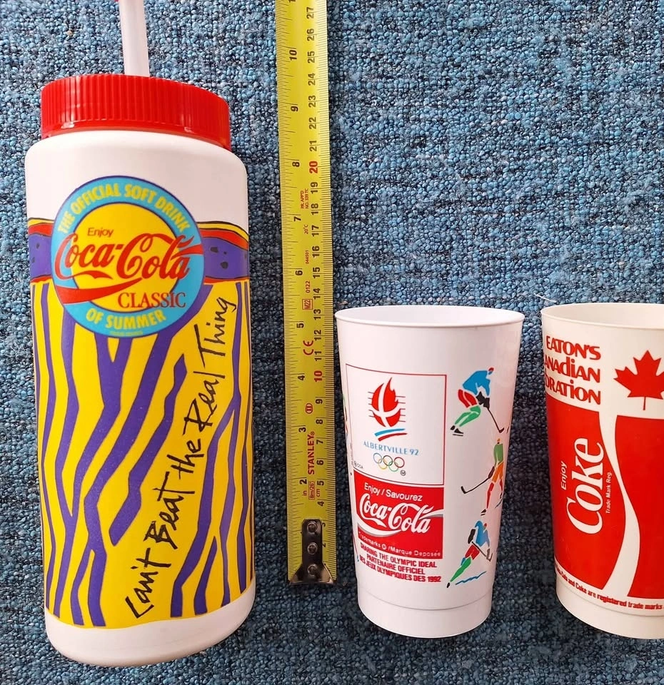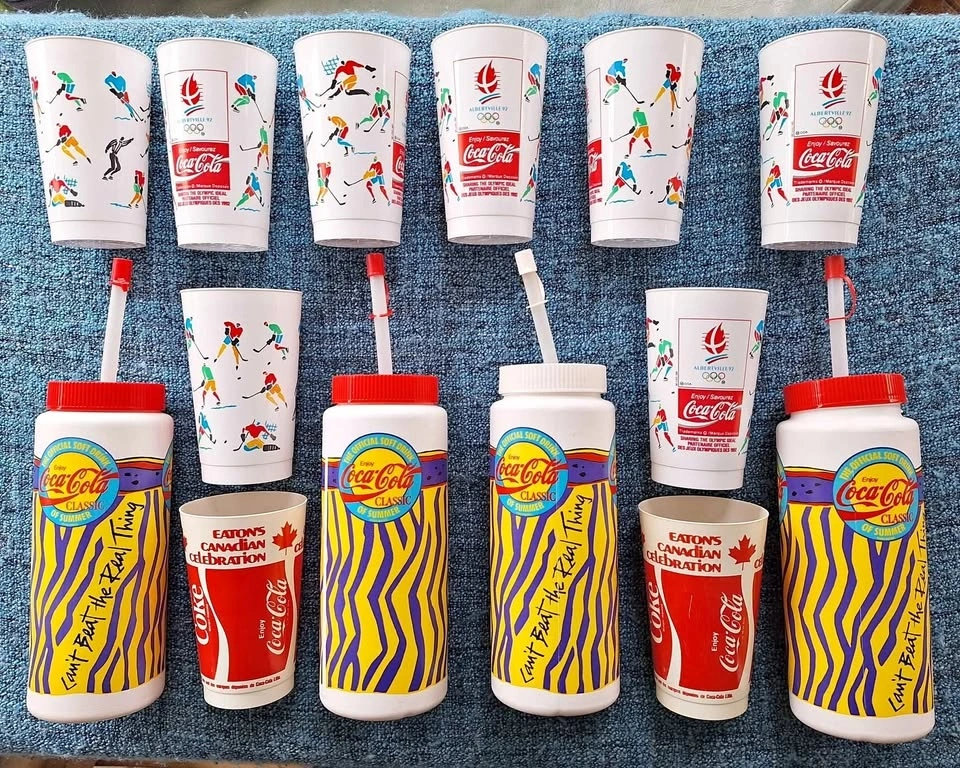 Plastic Coca Cola Bottles and Cups from 1980's & 1990's. Water bottles with straws are 8.5" tall snd 1992 Olympic & Eaton Cups are 5" tall. All 14 pieces are clean and scratch free, the 2 Eaton cups show time darkened plastic and 1 of them has some scratch lines from being stacked. Asking $20 for all.
