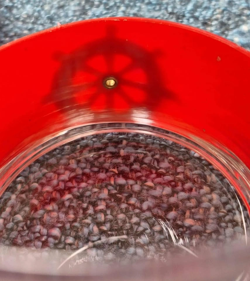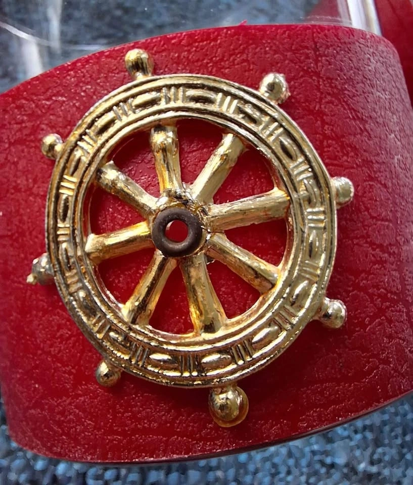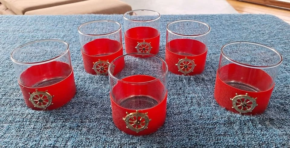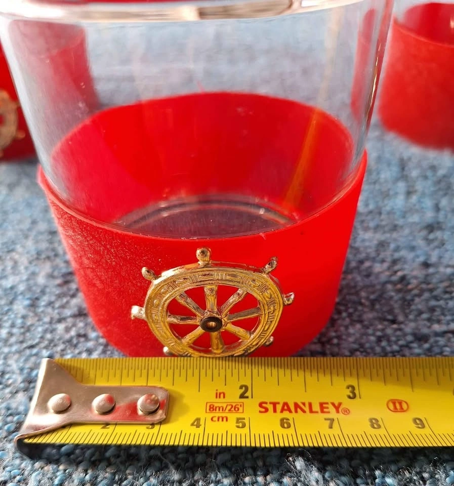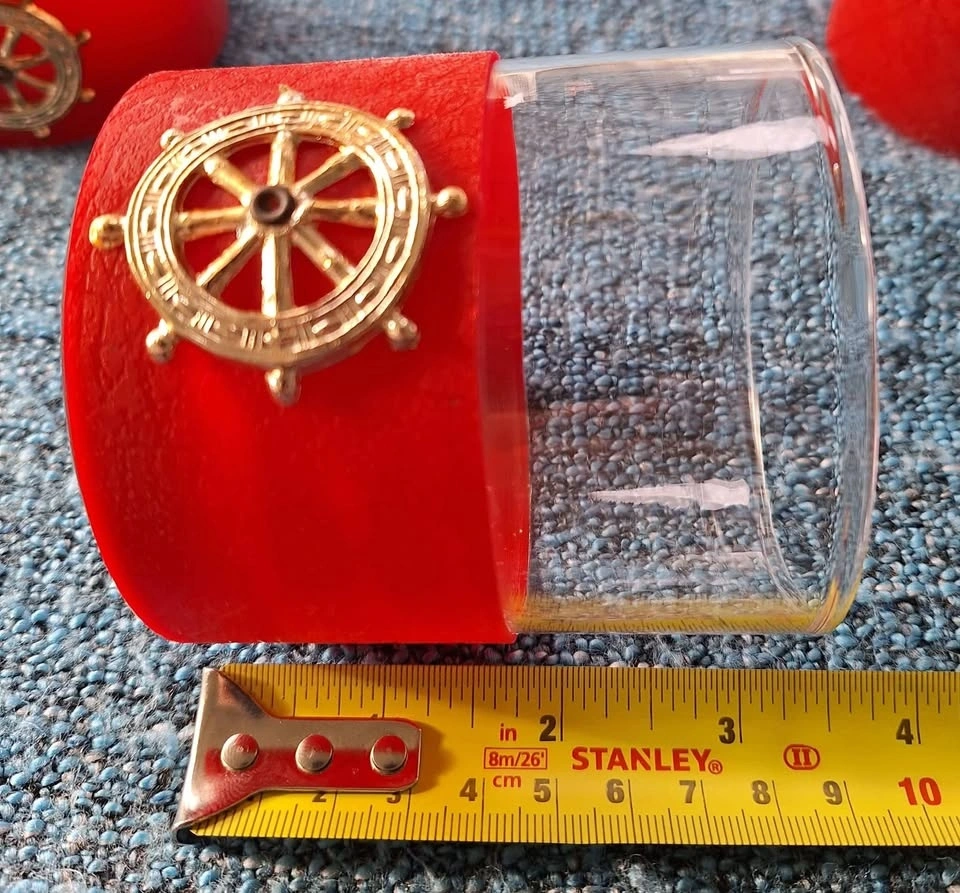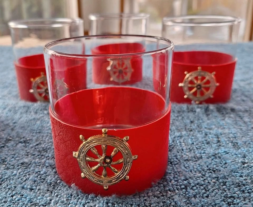 Vintage 1970's whiskey glasses with Pirate Ship Wheel. Glasses wrapped in red textured plastic with plastic pirate wheel grommeted into red sleeve. Holds firm and works hand wash.