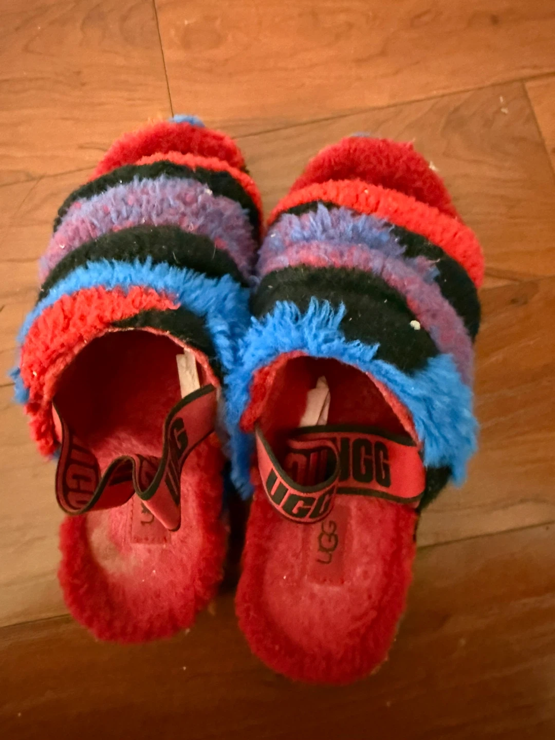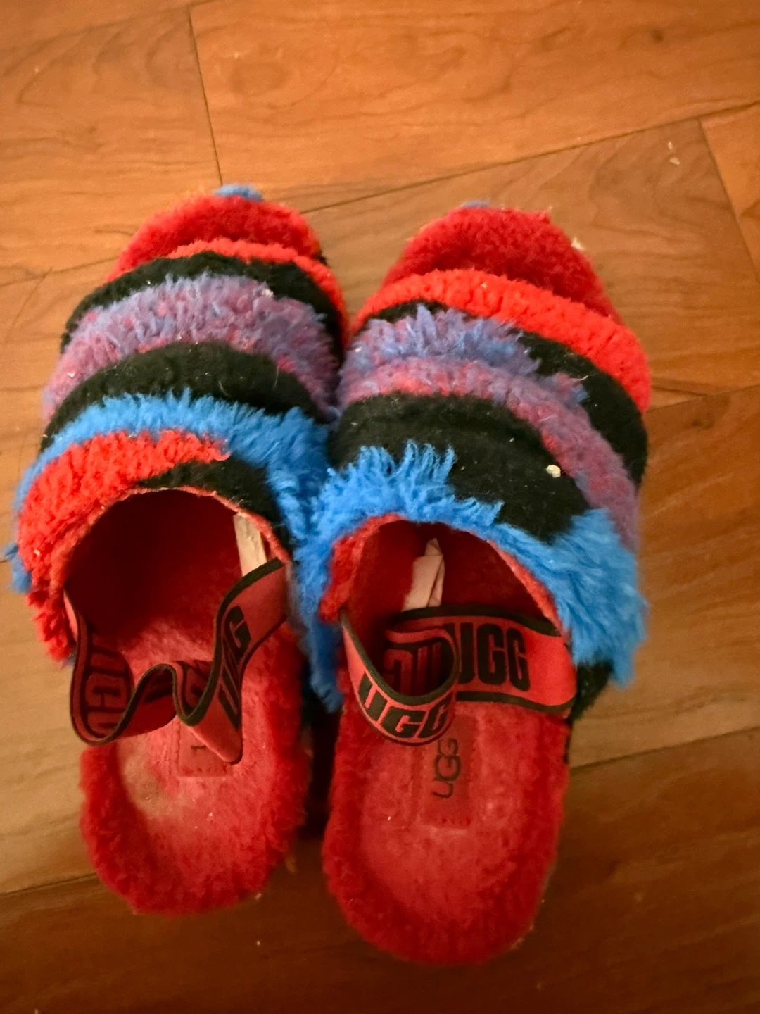 Selling a pair of UGG Fluff Yeah Pride slides in a size 7. They're super comfy and have a fun, colourful design. Perfect for lounging around the house or adding a pop of colour to your outfit! These have the UGG logo on the strap.