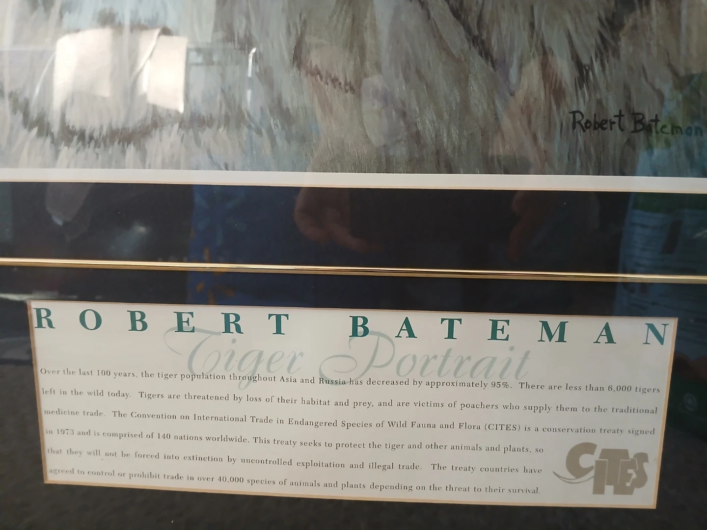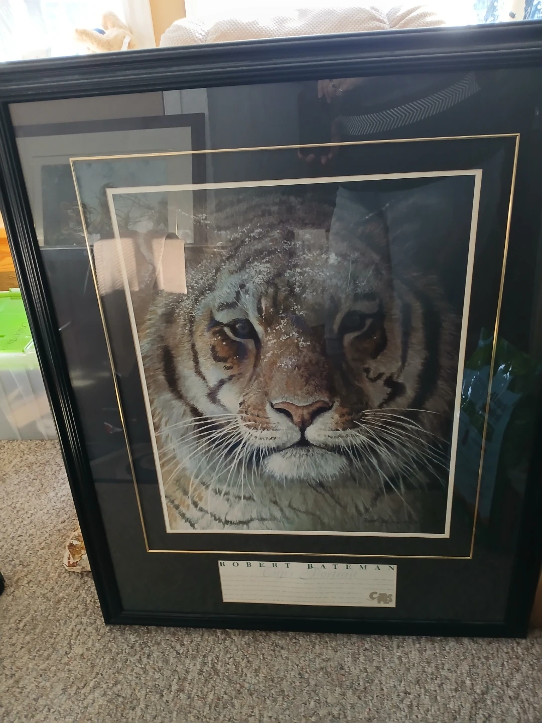 Selling a framed Robert Bateman tiger portrait. The artwork depicts a detailed tiger face. The painting is signed by Robert Bateman and dated 1998.
