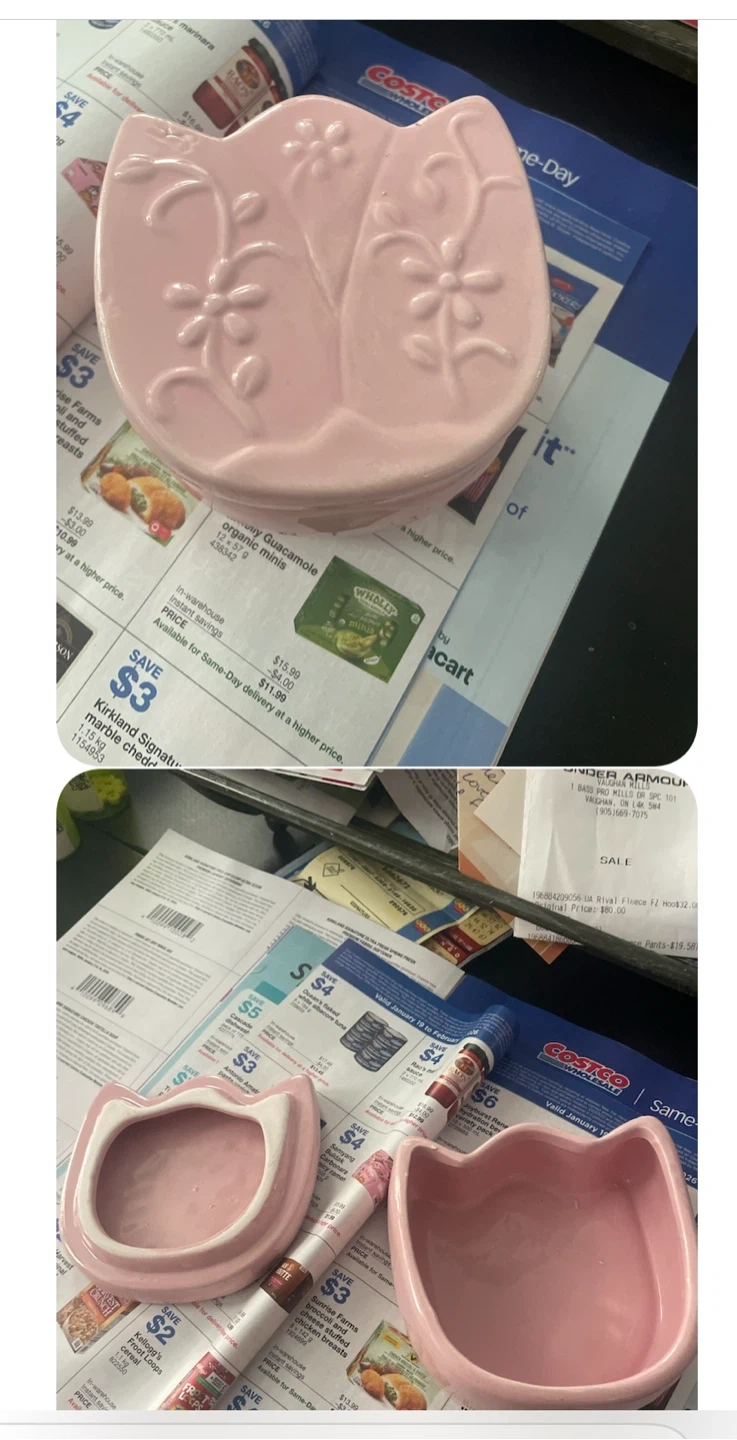 This adorable pink trinket dish. It's perfect for holding small items like jewelry or keys. It's in great condition and ready to add a touch of whimsy to your space