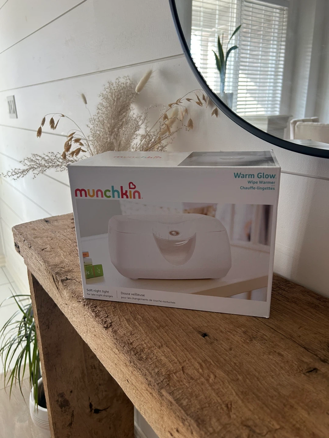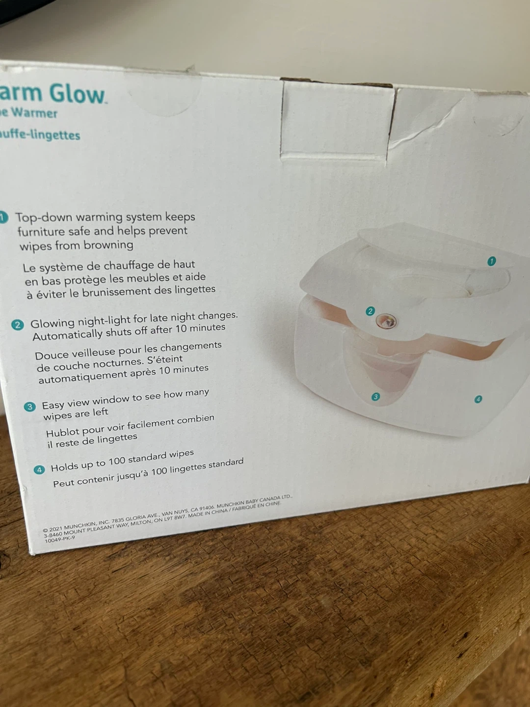 Selling a brand new Munchkin Warm Glow Wipe Warmer! It's still in the box and ready to go. This warmer features a top-down warming system to keep wipes safe from browning. It also has a glowing night-light that automatically shuts off after 10 minutes, perfect for those late-night changes. Plus, there's an easy view window to see how many wipes are left, and it holds up to 100 standard wipes