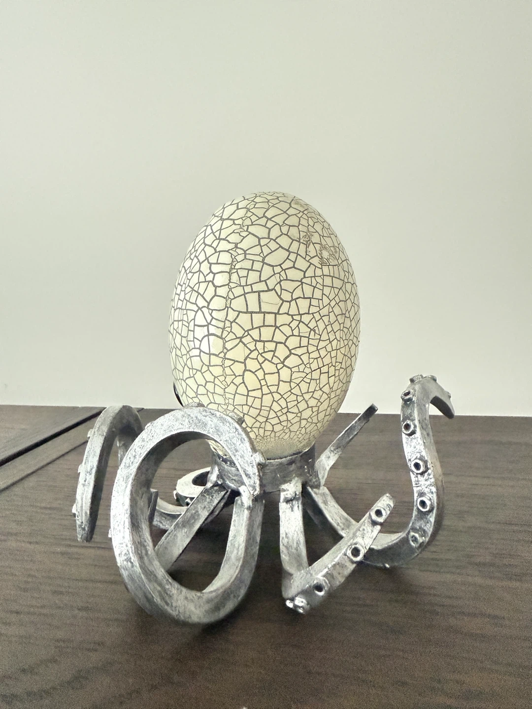 This is a unique and quirky octopus metal decoration. It features an egg-shaped body with a crackled pattern and metal octopus legs. It would be a fun addition to any room!