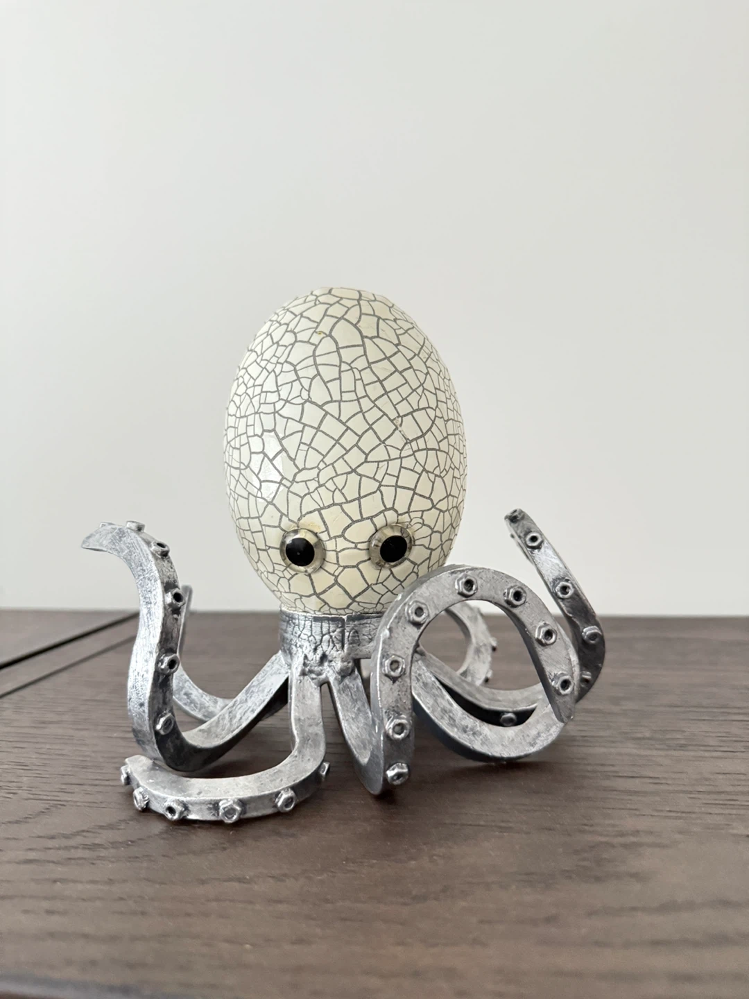 This is a unique and quirky octopus metal decoration. It features an egg-shaped body with a crackled pattern and metal octopus legs. It would be a fun addition to any room!