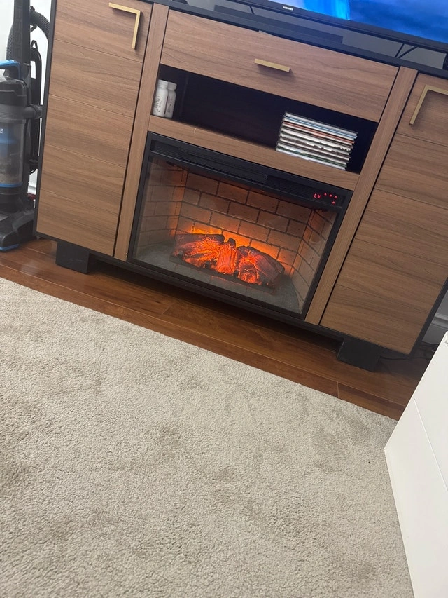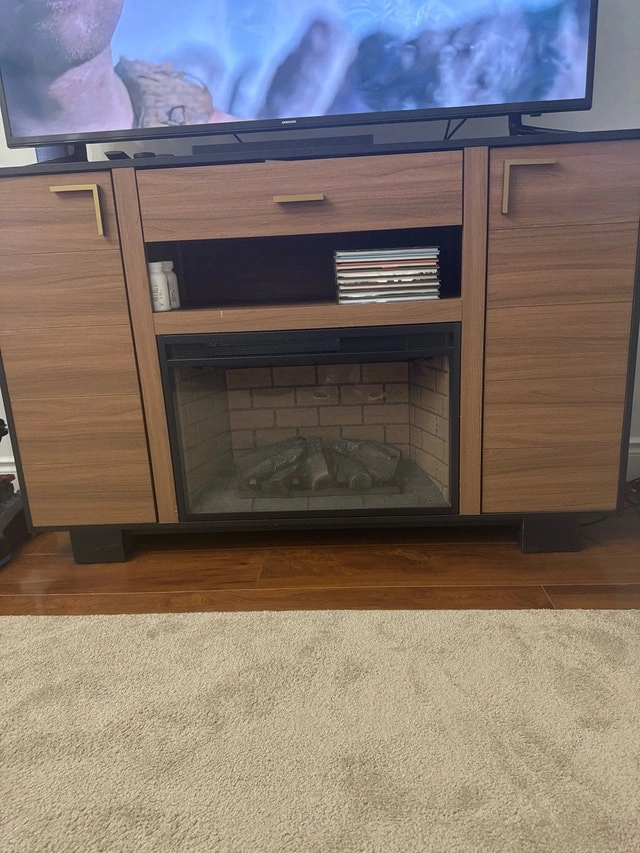 Enhance your living space with this stylish fireplace TV stand. This used unit features a built-in electric fireplace, offering both warmth and ambiance. The stand includes storage cabinets on each side and a media shelf with cord management.