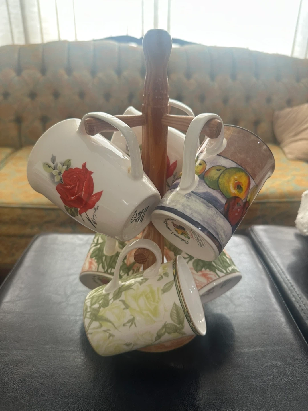 Selling a set of 6 vintage floral mugs with a wooden stand! The mugs feature different floral designs, including roses and other colourful patterns. Perfect for adding a touch of vintage charm to your kitchen or as a gift for a collector