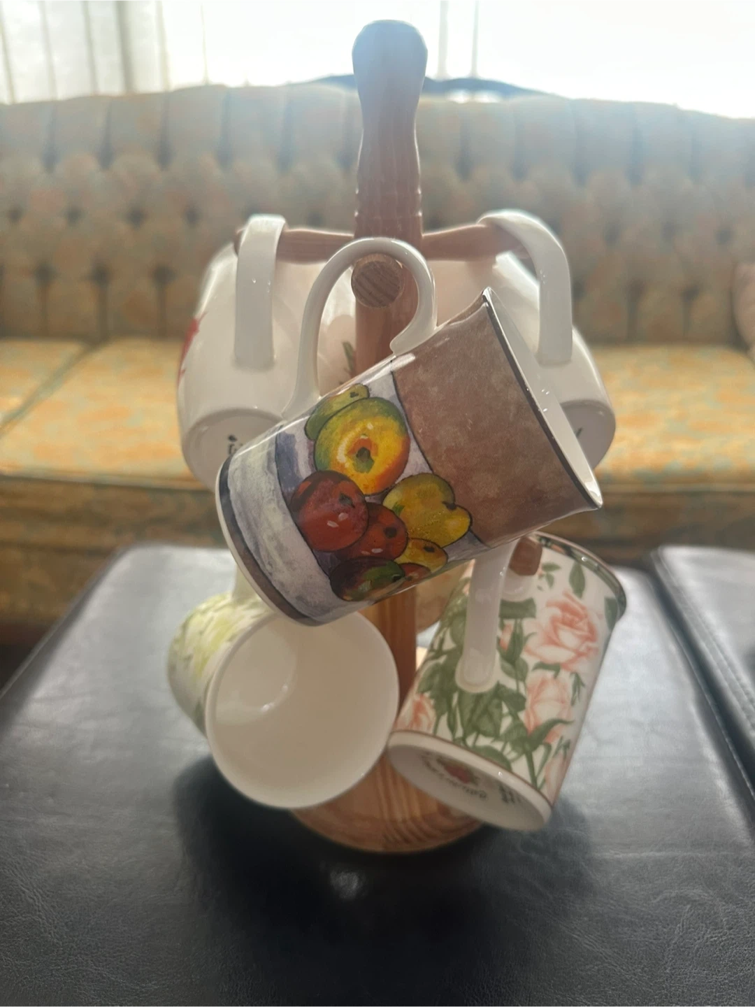 Selling a set of 6 vintage floral mugs with a wooden stand! The mugs feature different floral designs, including roses and other colourful patterns. Perfect for adding a touch of vintage charm to your kitchen or as a gift for a collector