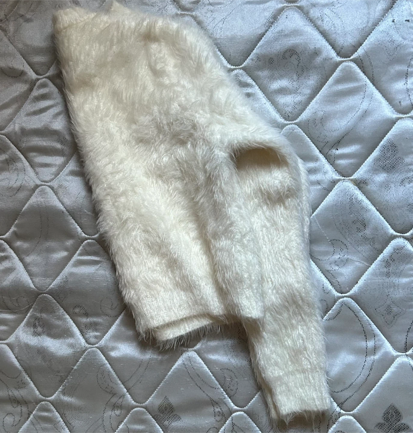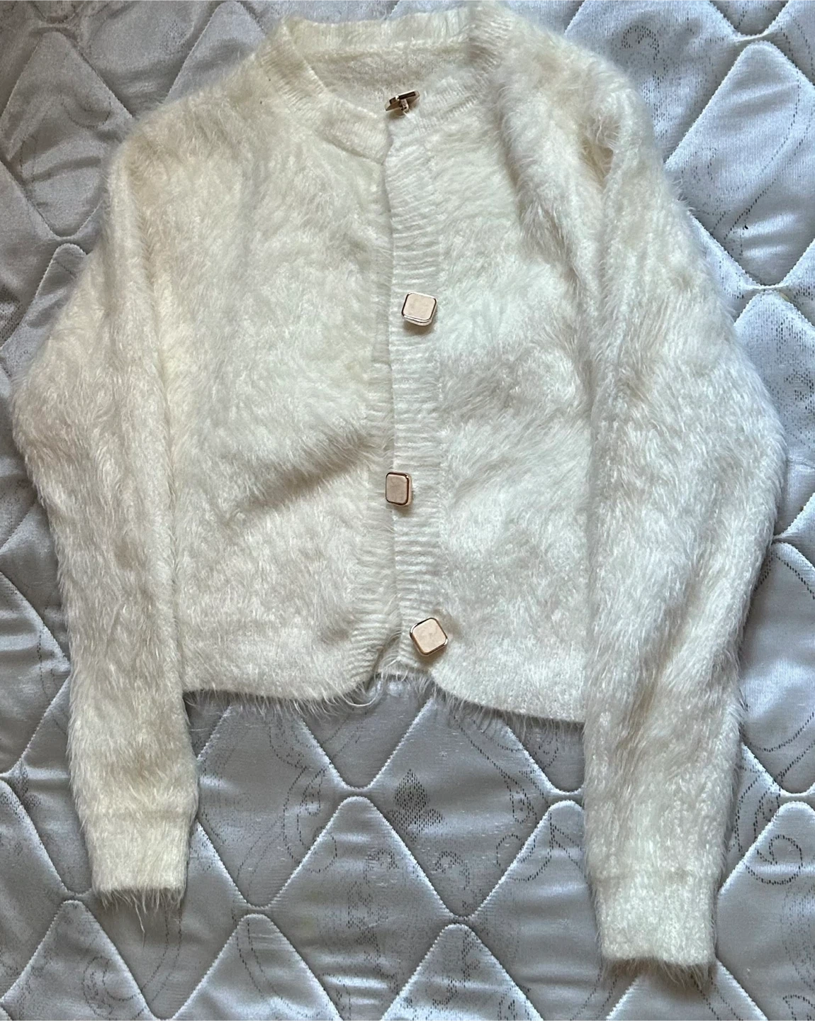 Selling a super soft and fuzzy knit cardigan! It's a beautiful white colour and features stylish buttons. Perfect for layering during the cooler months or adding a touch of cozy chic to any outfit