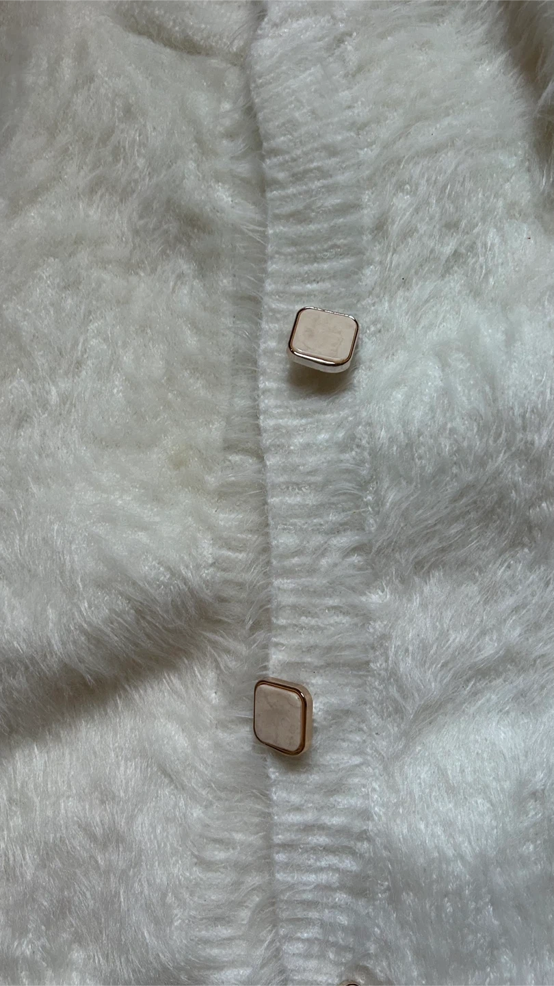 Selling a super soft and fuzzy knit cardigan! It's a beautiful white colour and features stylish buttons. Perfect for layering during the cooler months or adding a touch of cozy chic to any outfit
