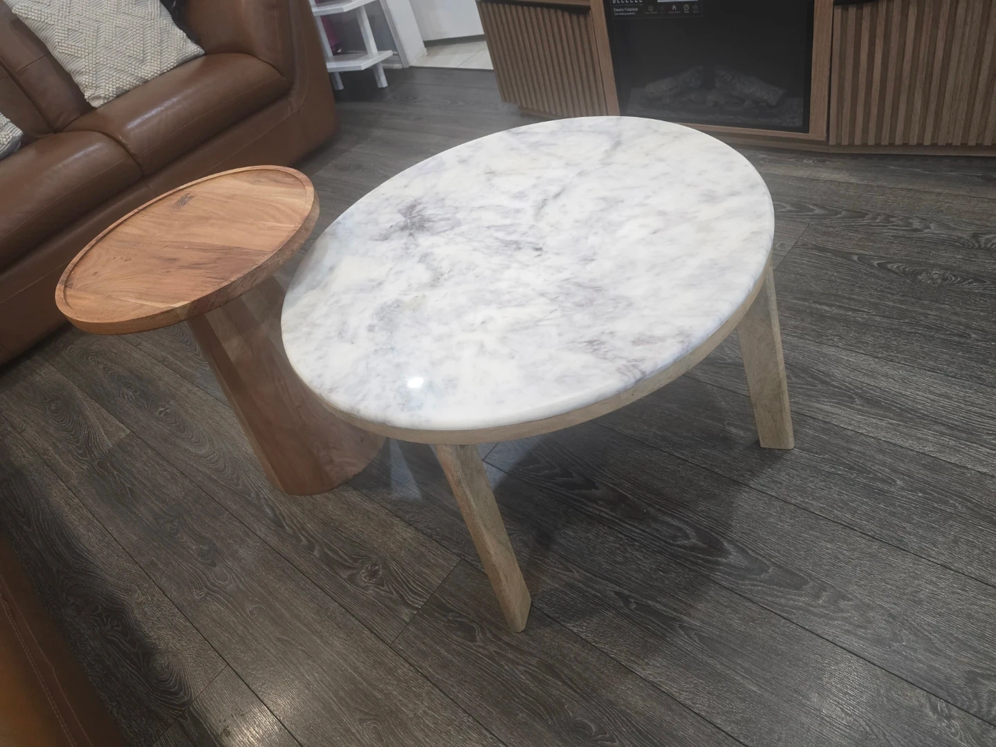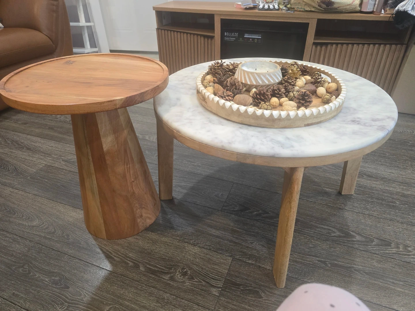 Selling a set of nesting coffee tables! One is a round marble table with light wood legs, and the other is a smaller, round wooden table with a unique pedestal base. They're a stylish addition to any living room!
