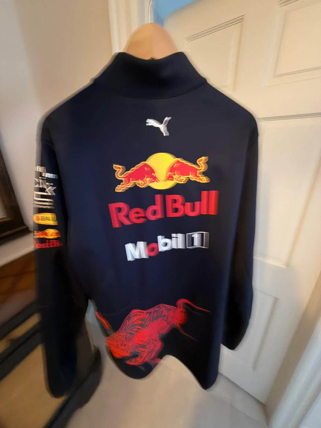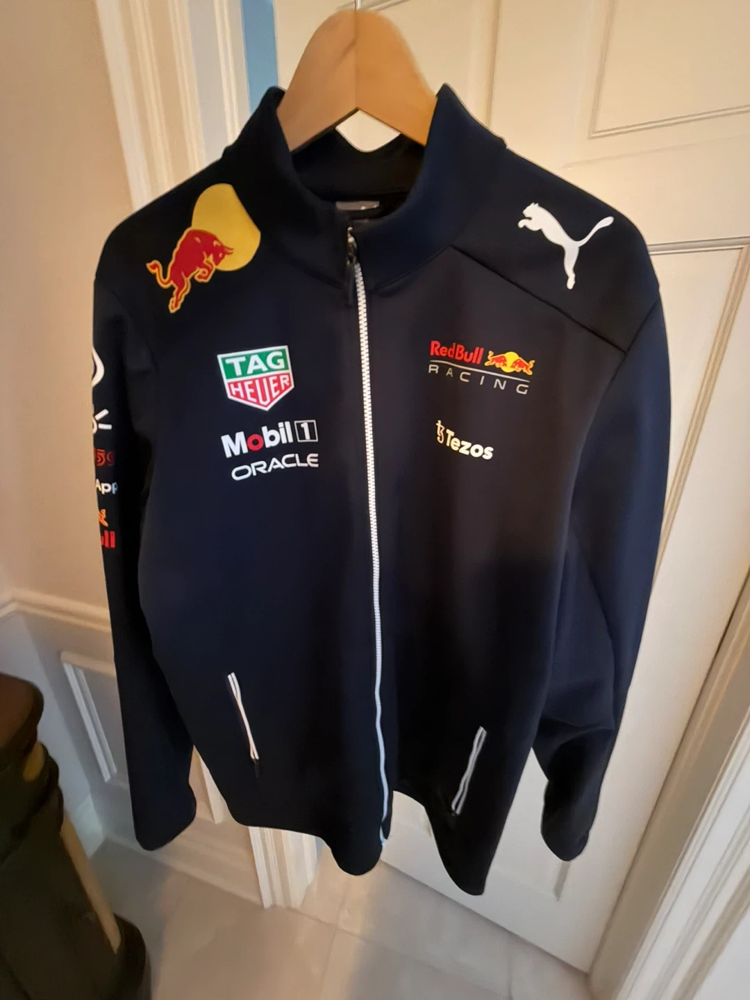 Selling a Puma Red Bull Racing jacket in size L. It's in great condition and features the Red Bull Racing logo along with sponsor logos like TAG Heuer, Mobil 1, and Tezos. This is the 2023 season Max won the world drivers championship.