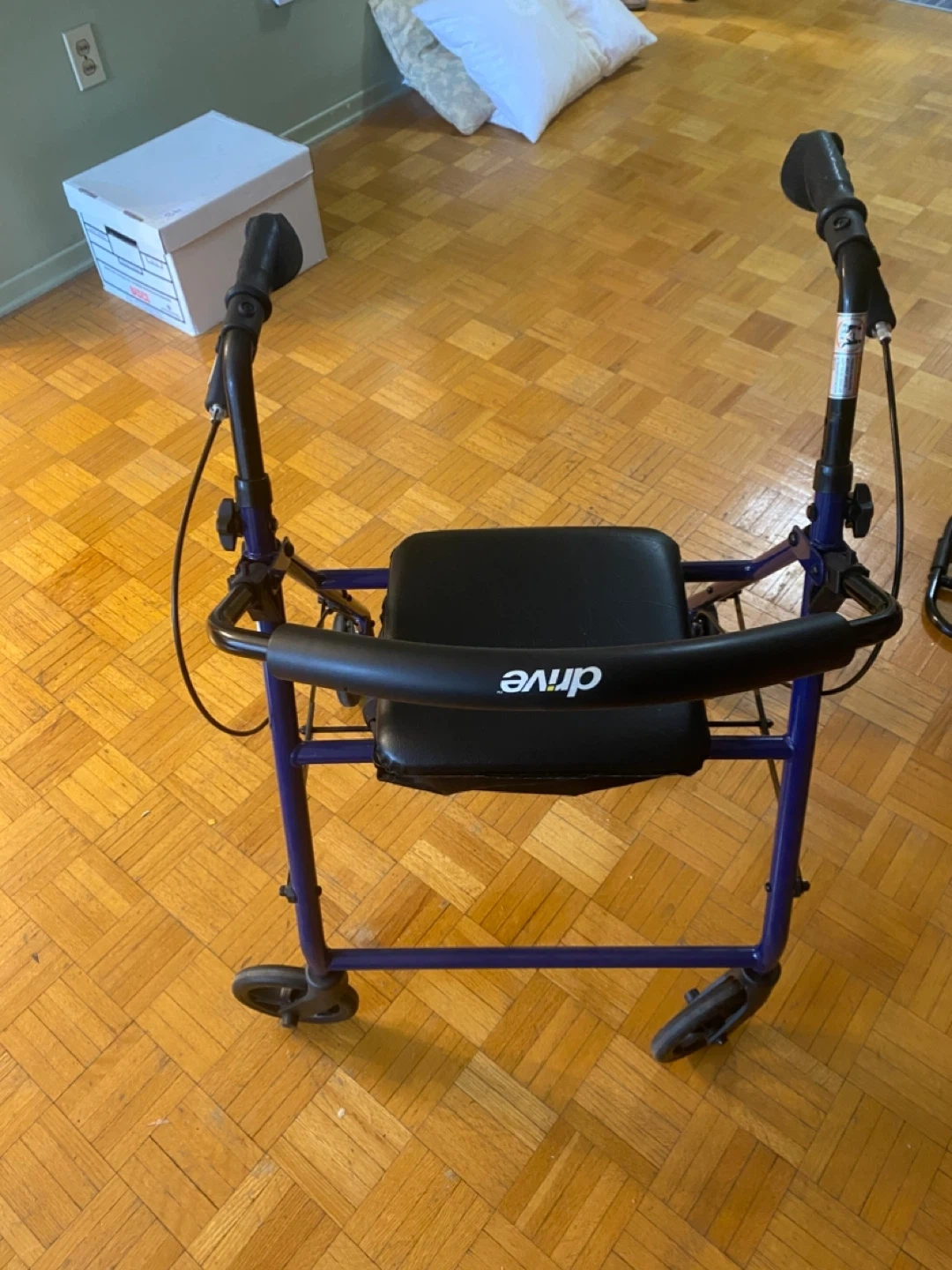 Selling a Drive Medical walker with a seat. It's in great condition and ready to help someone get around comfortably. The walker is blue and black, and it folds up for easy storage and transport. Perfect for indoor or outdoor use