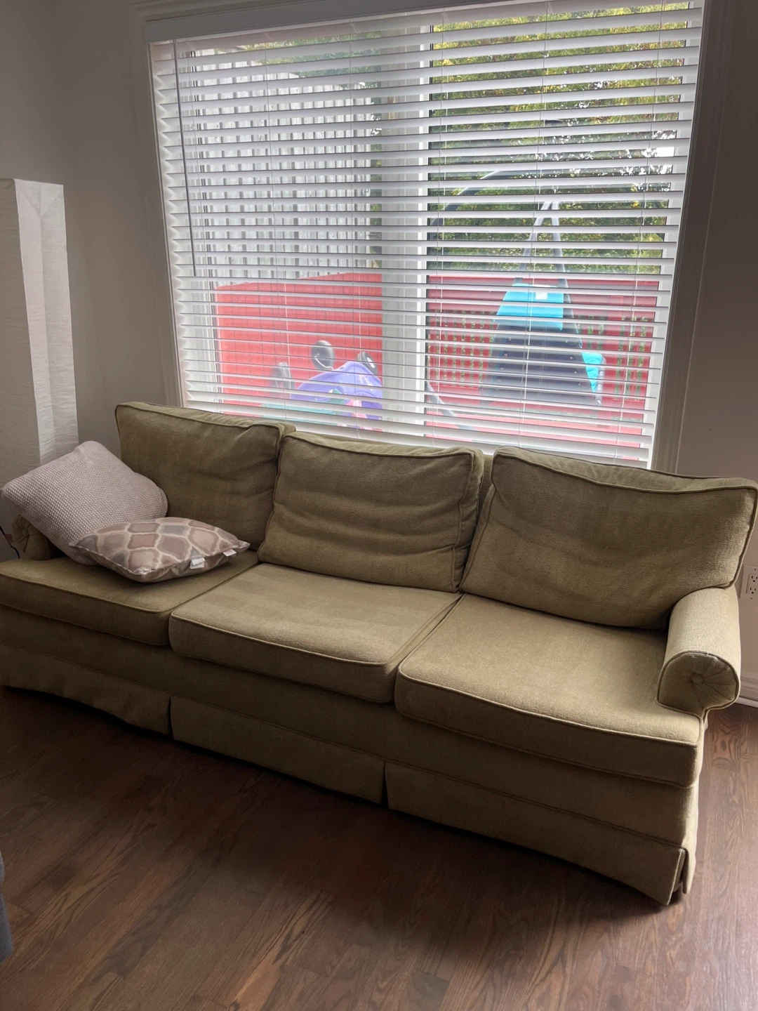 Selling a comfy green sofa. It's in good condition and would be great for a living room or den. It has a classic design that would fit in with many different styles of decor; if interested just message me; Thanks