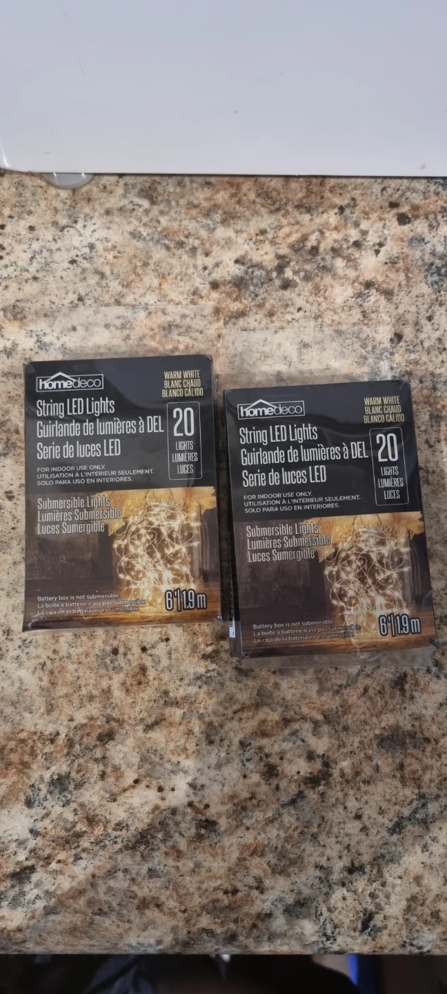 Selling two brand new boxes of Home Deco String LED Lights! These lights are perfect for indoor use and each string is 6' (1.9m) long. They give off a warm white light. Please note that the battery box is not submersible