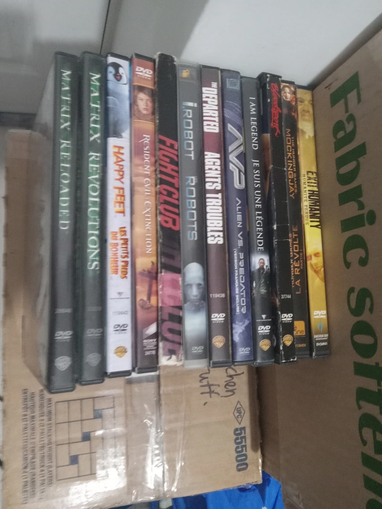 Selling a collection of DVDs, including titles like The Matrix, I, Robot, and Collateral. Perfect for movie nights!