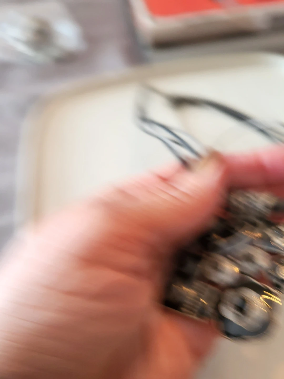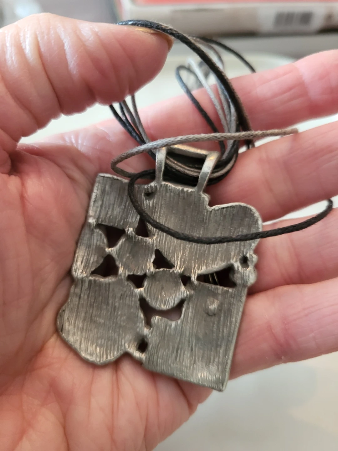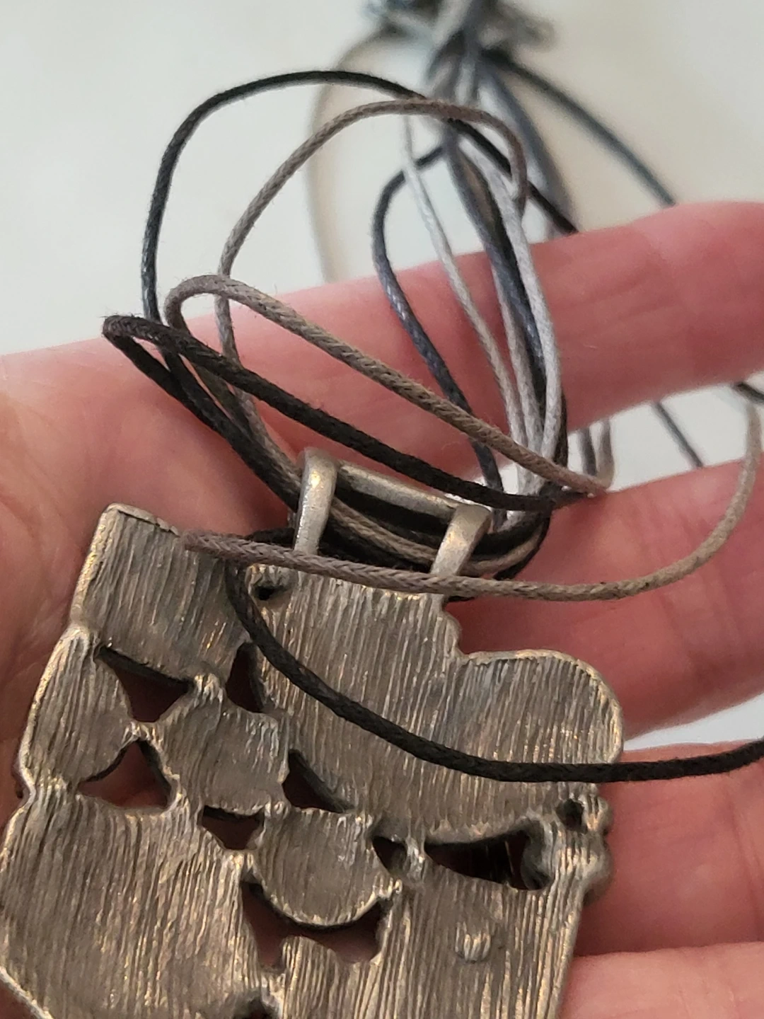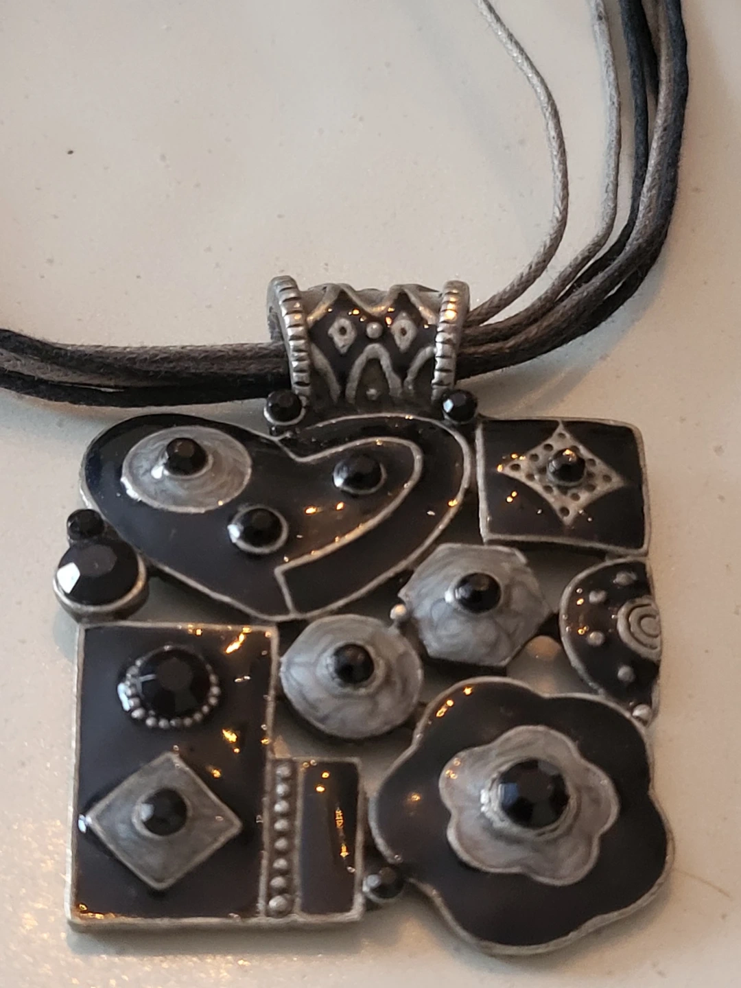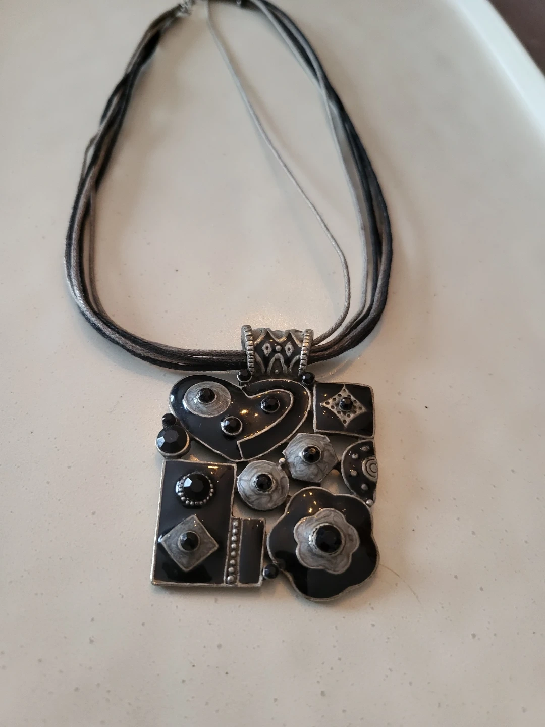 This is a pendant necklace with a square pendant. The pendant has a black and silver tone design with various shapes and stones. It has a multi-strand cord.