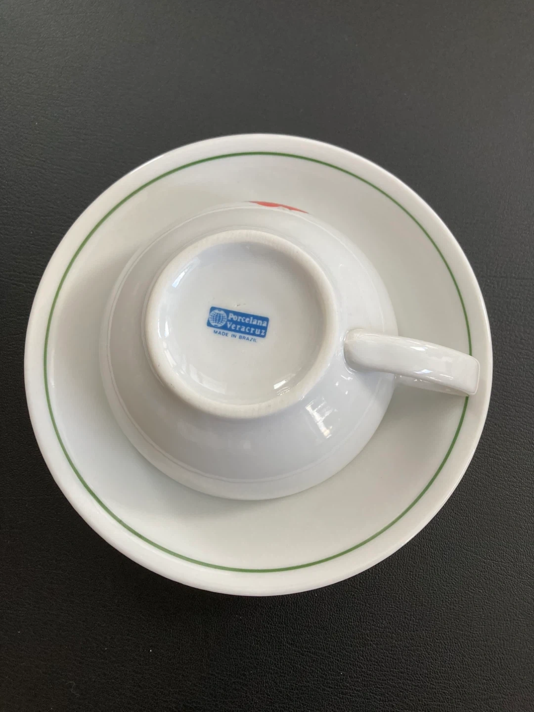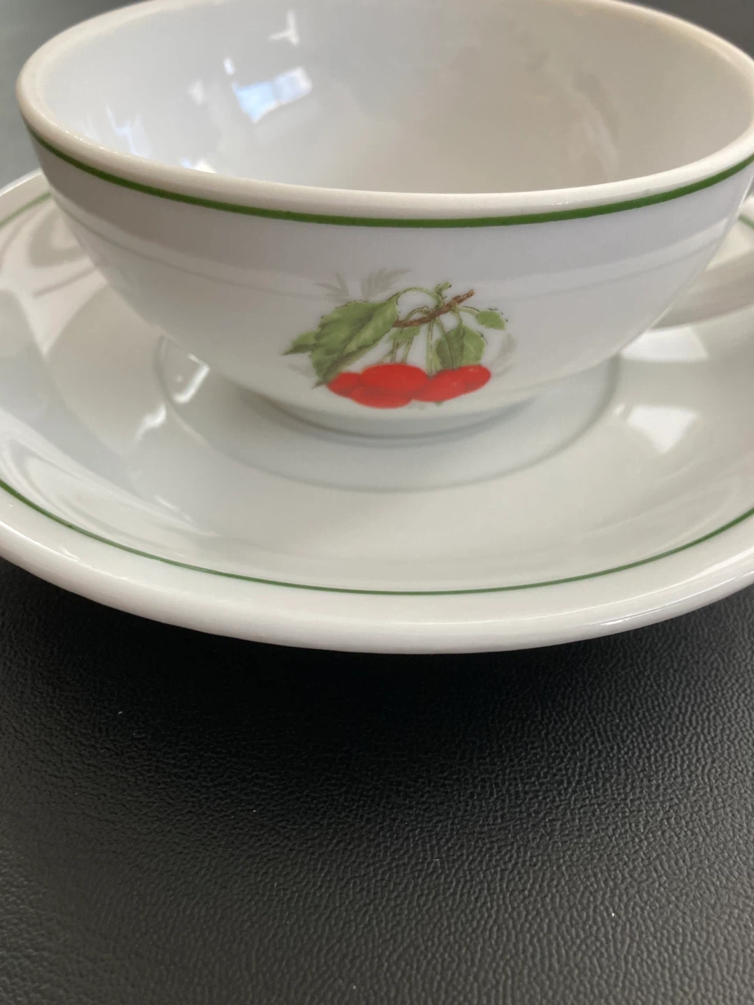 Selling a Veracruz, made in Brazil wide mouth cup and saucer set with teapot. It's white with a green trim and red berry design.