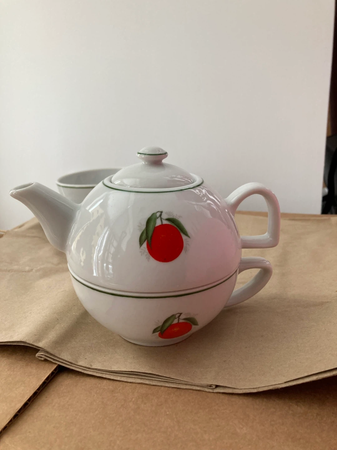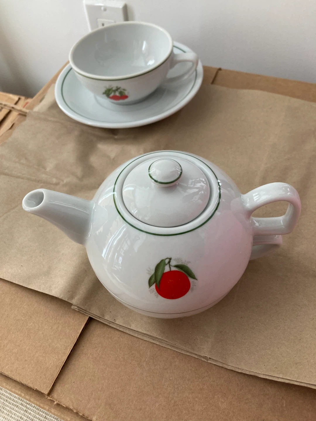 Selling a Veracruz, made in Brazil wide mouth cup and saucer set with teapot. It's white with a green trim and red berry design.