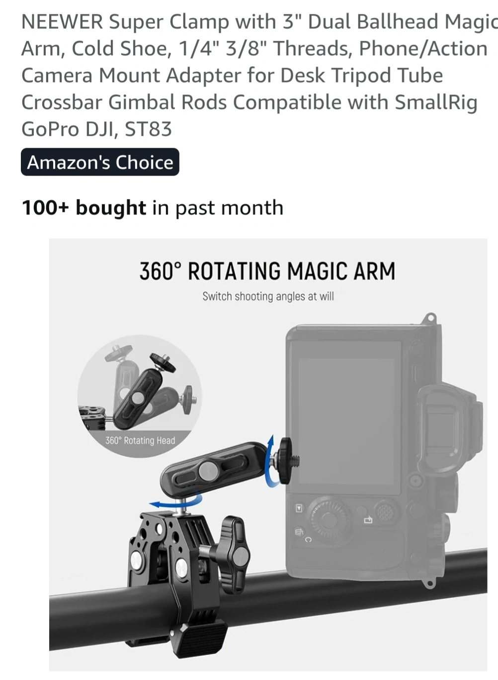 NEEWER Super Clamp with 3" Dual Ballhead Magic Arm, Cold Shoe, 1/4" 3/8" Threads, Phone/Action Camera Mount Adapter for Desk Tripod Tube Crossbar Gimbal Rods Compatible with SmallRig GoPro DJI, ST83.