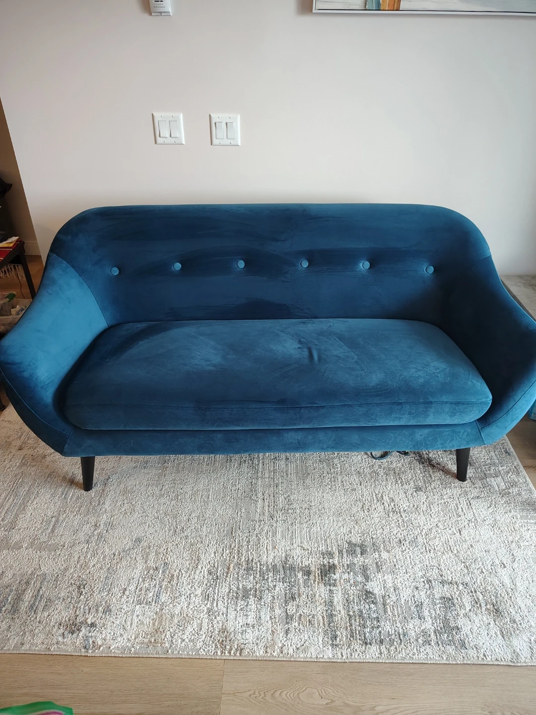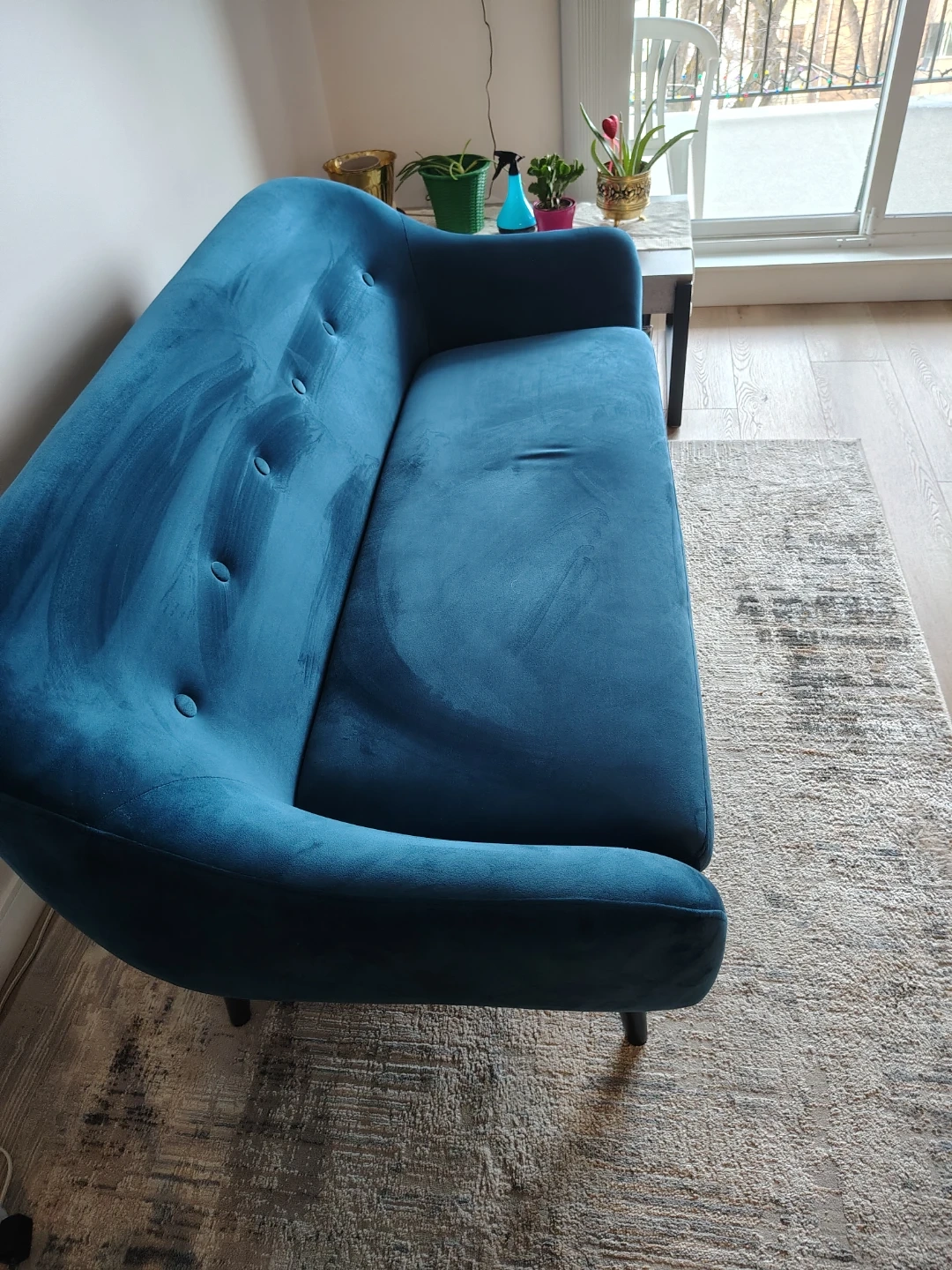 Selling a lovely blue velvet 3 seat sofa. It's in good condition and would be a great addition to any living space. The velvet material gives it a soft and luxurious feel!