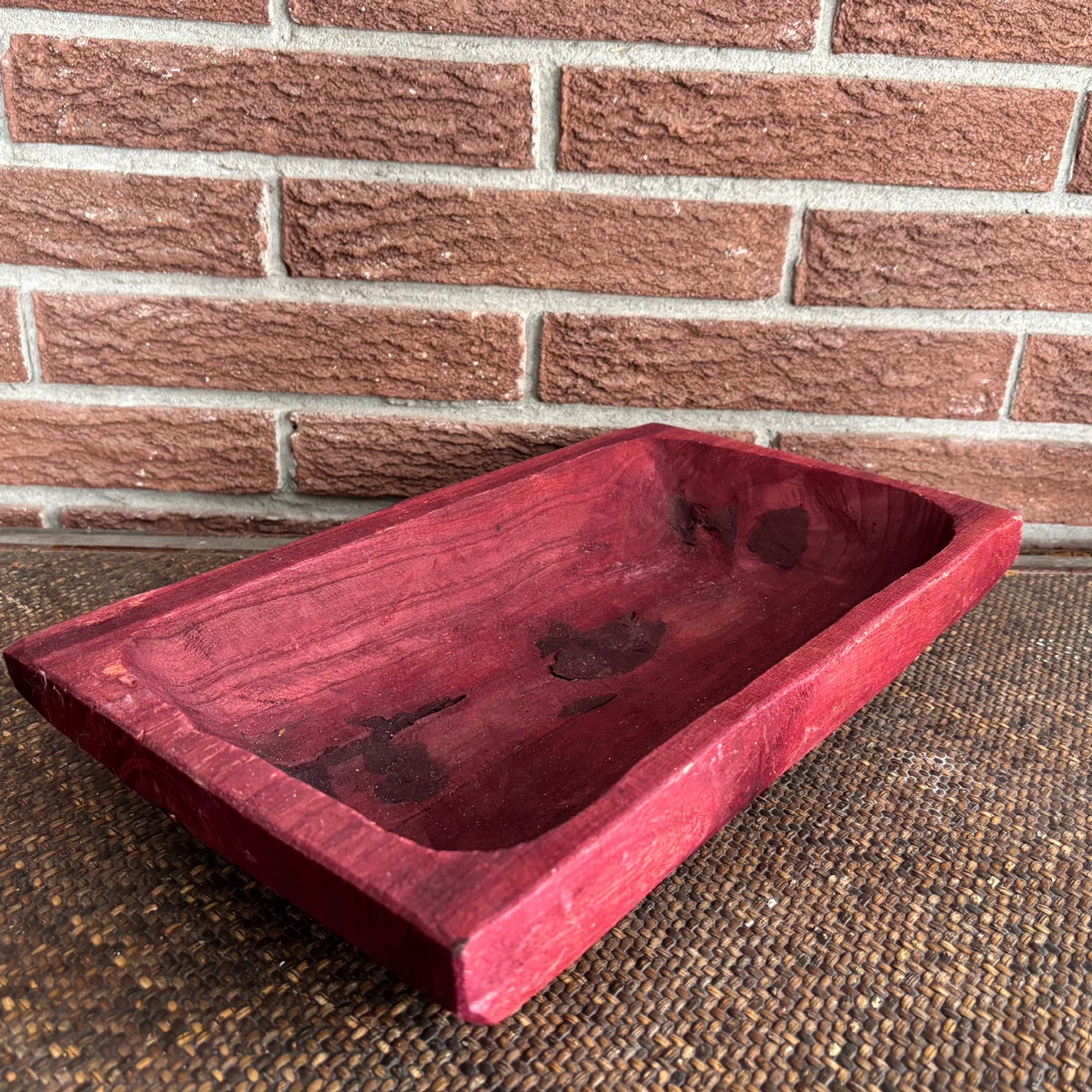 Selling a handmade red-stained wood “dough” bowl or trug. It has some signs of use, as seen in the pictures. It measures approximately 17 inches long and 10 inches wide.