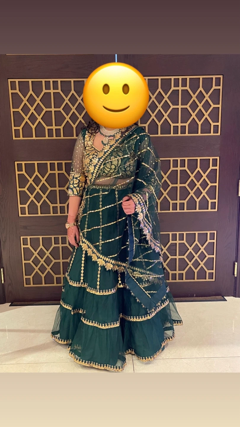 Beautiful dark green lehenga with heavy golden embroidery, mirror work, and net dupatta. Worn only once for a wedding event. The outfit looks elegant, festive, and perfect for weddings, receptions, engagements, or sangeet events.