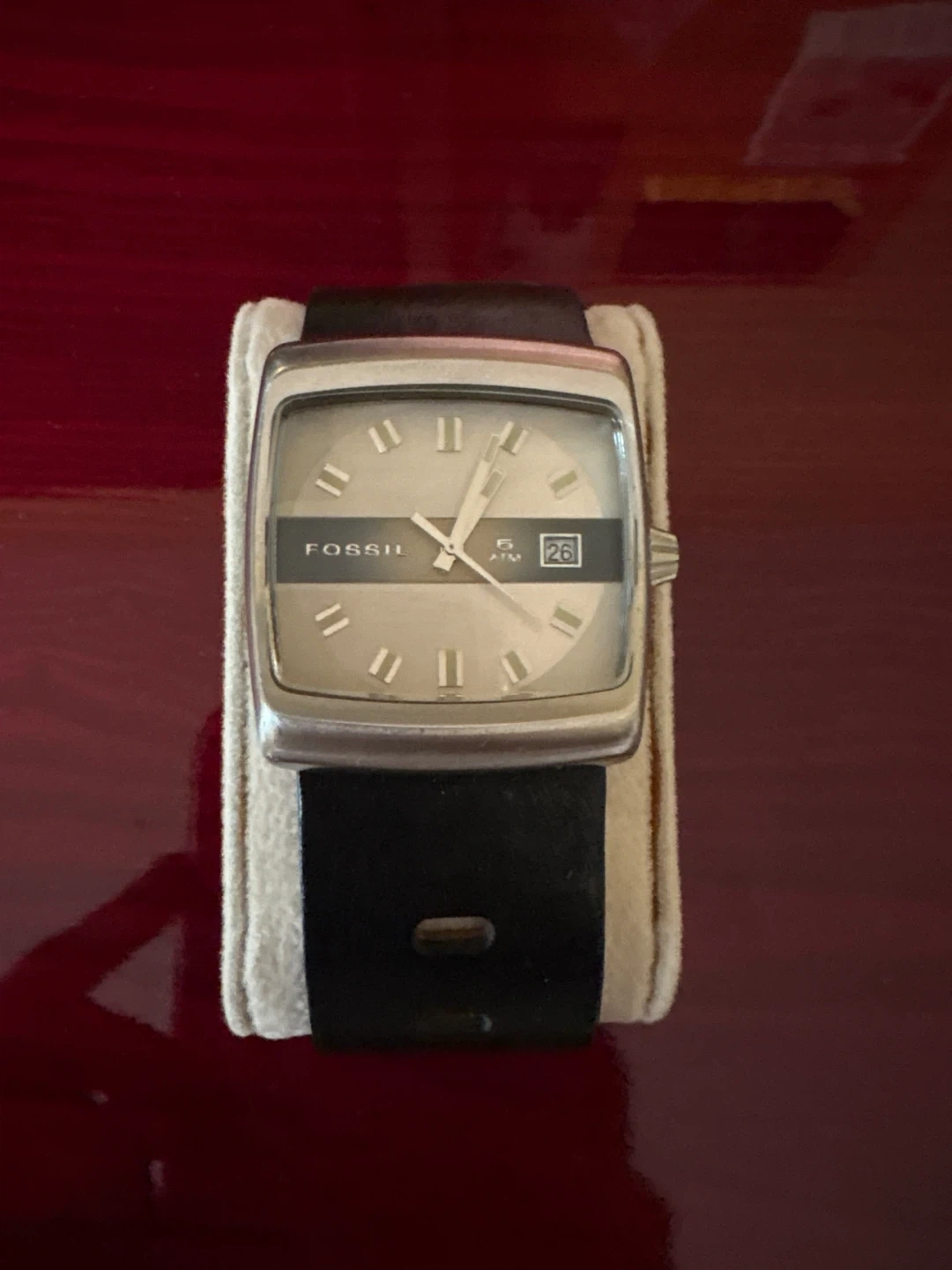 Selling a Fossil watch with a black leather band. The watch face is silver with a date display. It's in good condition and ready for a new wrist!