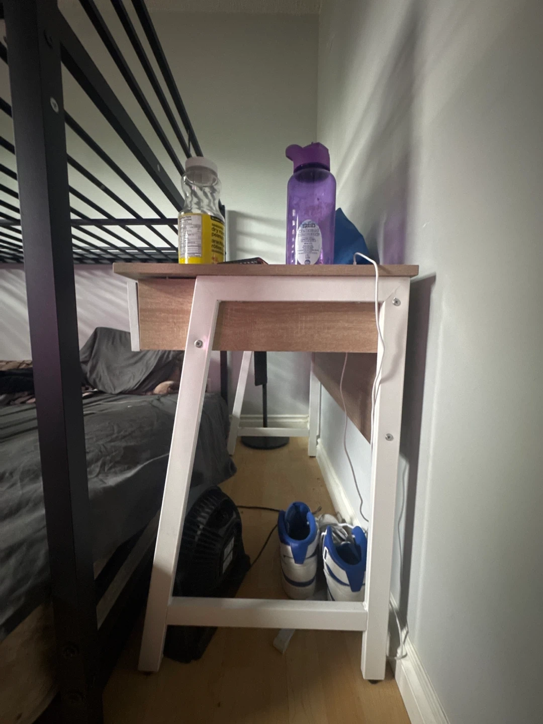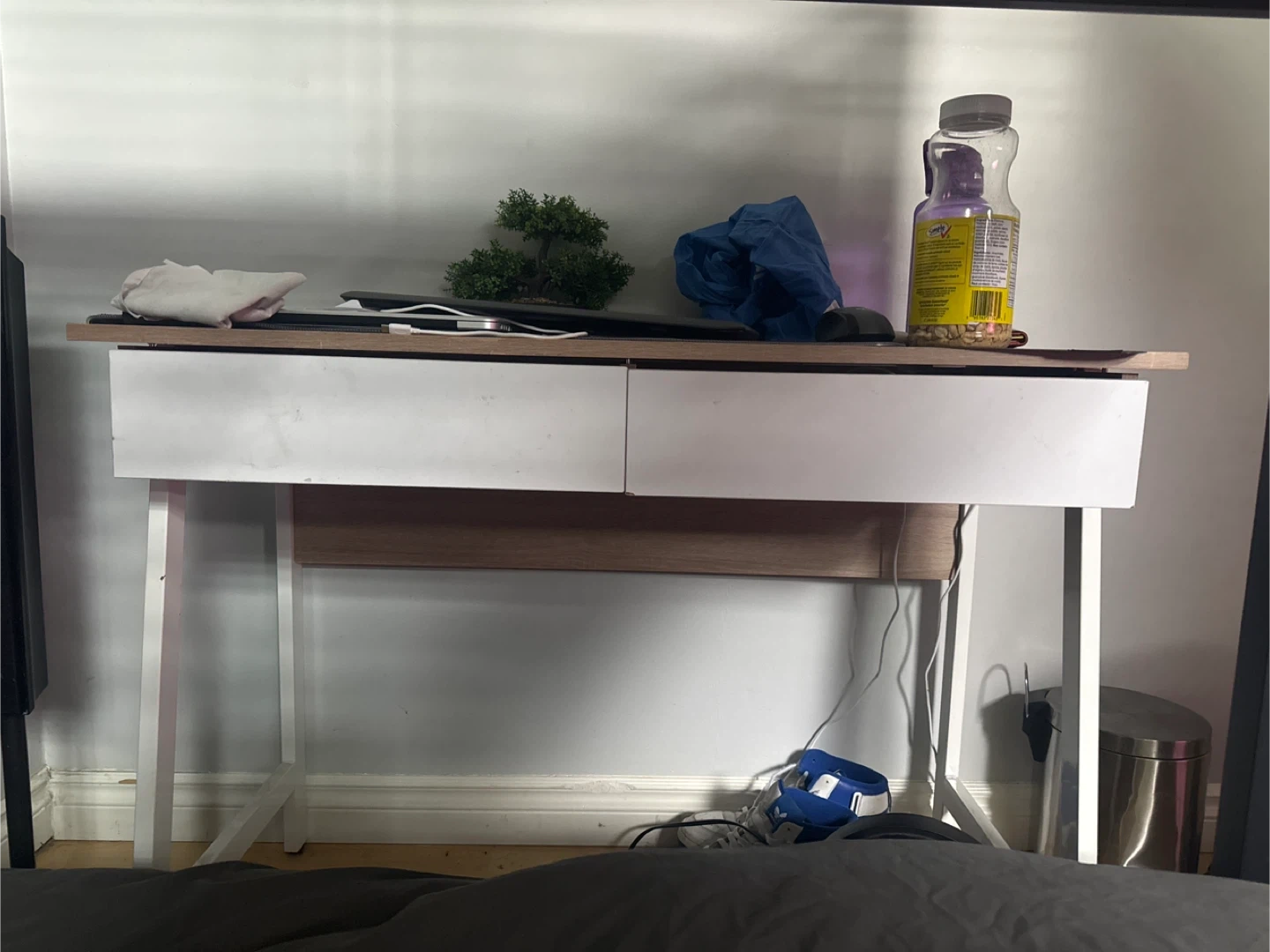 Selling a desk with a light wood top and white legs! It has built-in USB ports, which is super handy. It's in good condition and ready for a new workspace