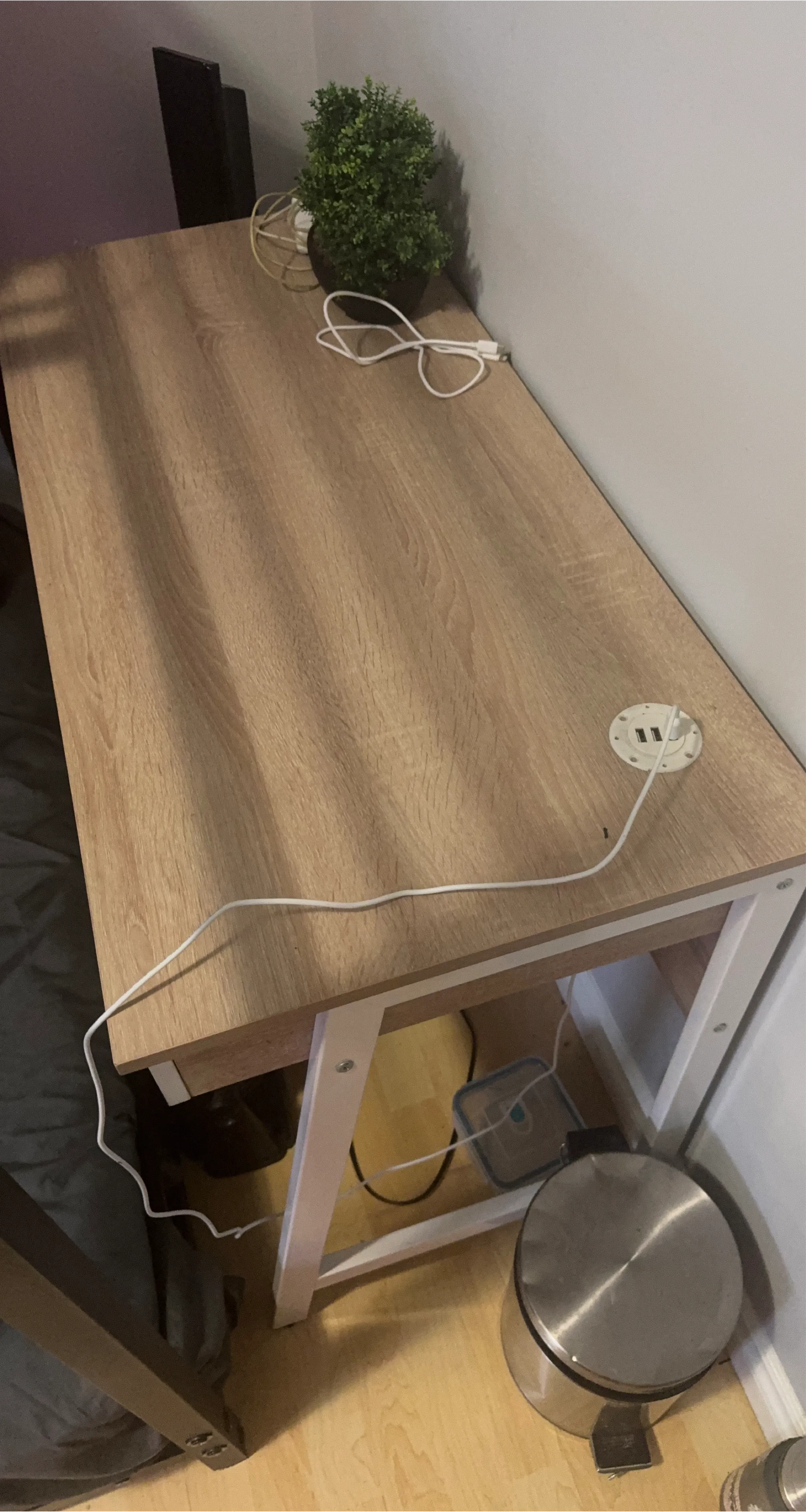 Selling a desk with a light wood top and white legs! It has built-in USB ports, which is super handy. It's in good condition and ready for a new workspace