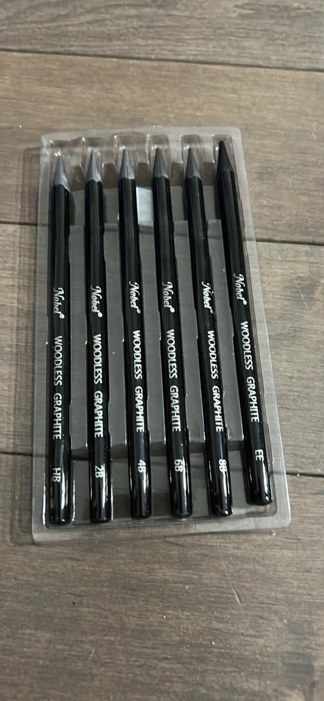 Selling a set of Nobel woodless graphite pencils! This set includes a variety of lead grades, from HB to EE, perfect for sketching and drawing. They're in their original packaging, ready for a new artist to use