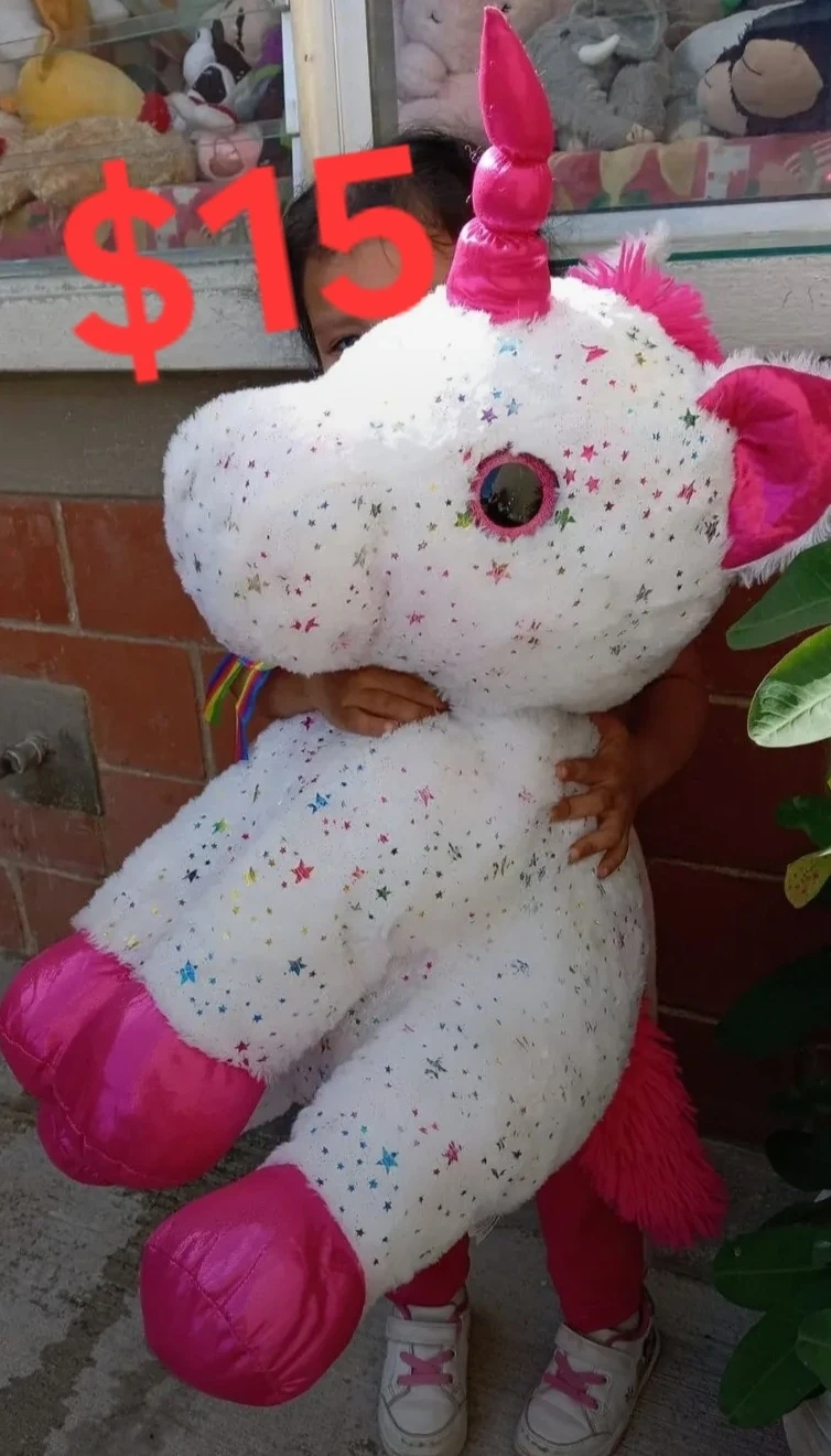 Selling a large unicorn plush toy! It's white with colourful stars all over, and has pink accents. Perfect for a kiddo who loves unicorns