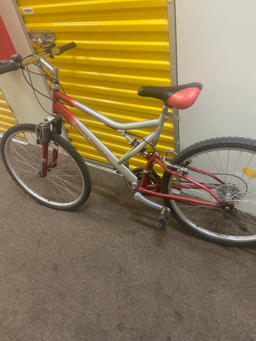 Selling a Roadmaster Granite Peak mountain bike. It's a silver and red color. Great for cruising around the neighborhood or hitting some trails