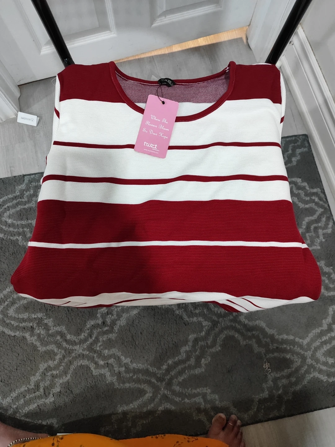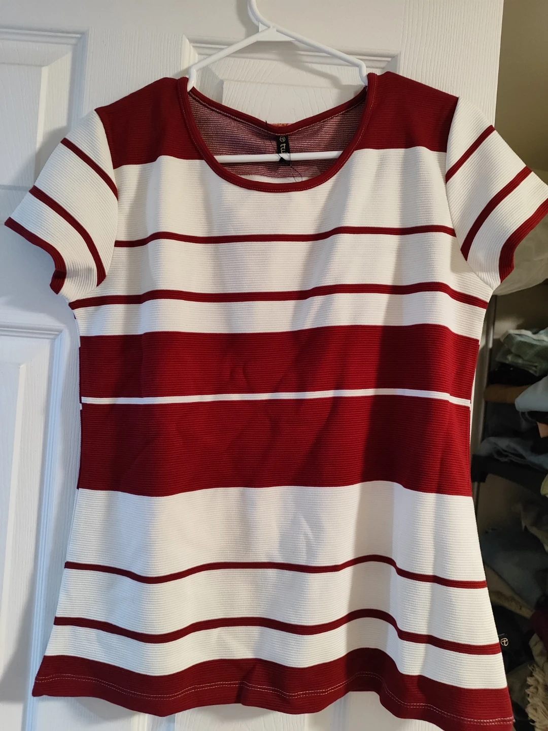 This is a cute Twist brand top with red and white stripes! It's a size medium and features a ribbed texture. Perfect for a casual and stylish look!