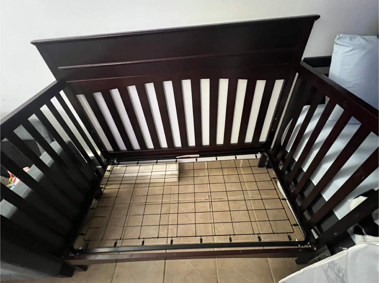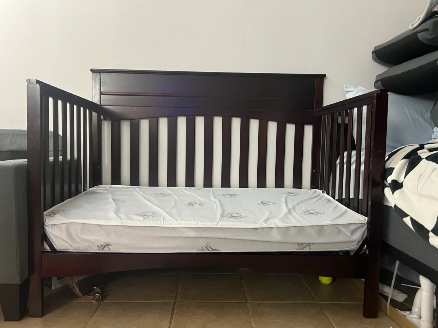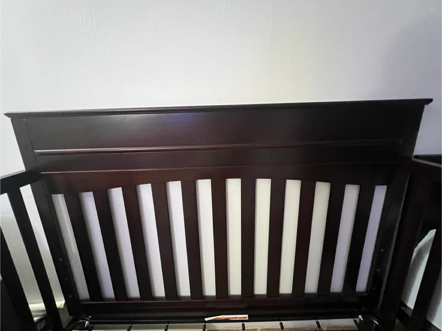 Selling a convertible crib in a dark brown color. Convertible bed have all 4 sides. It's in good condition and ready for a new baby! Includes a mattress too!
