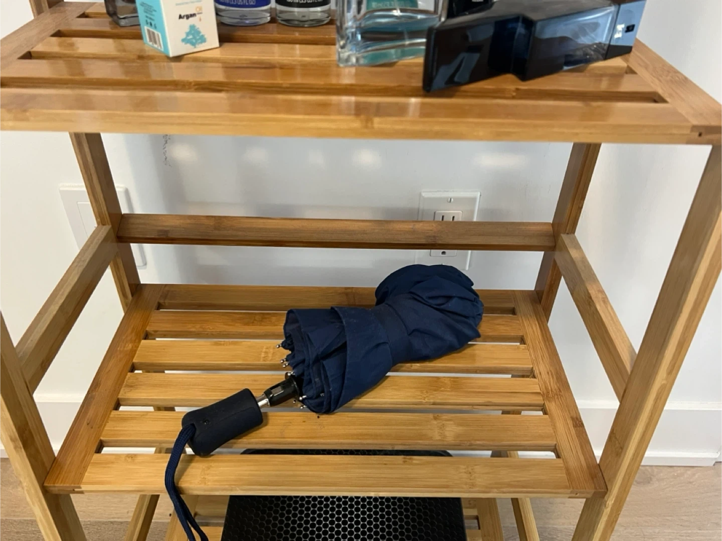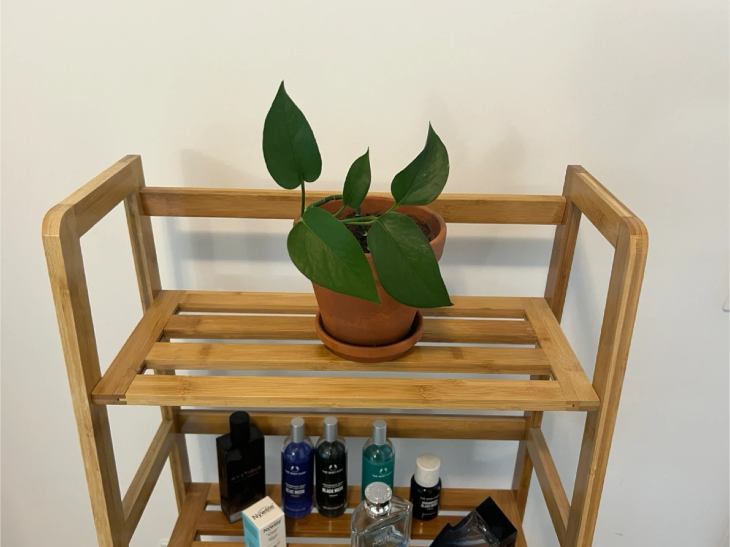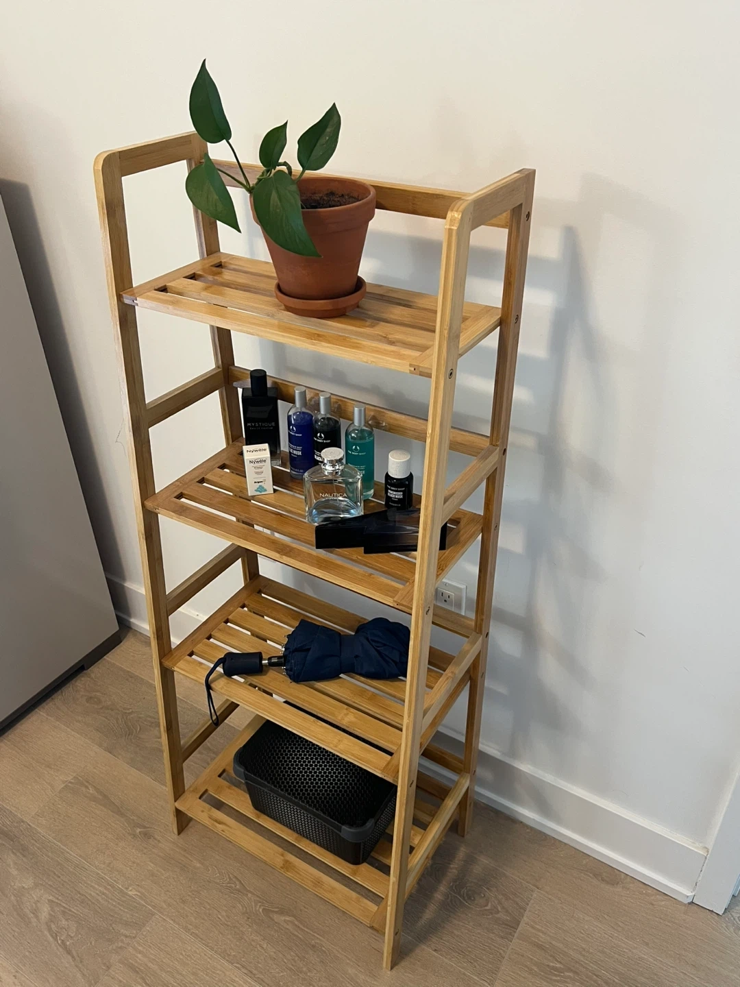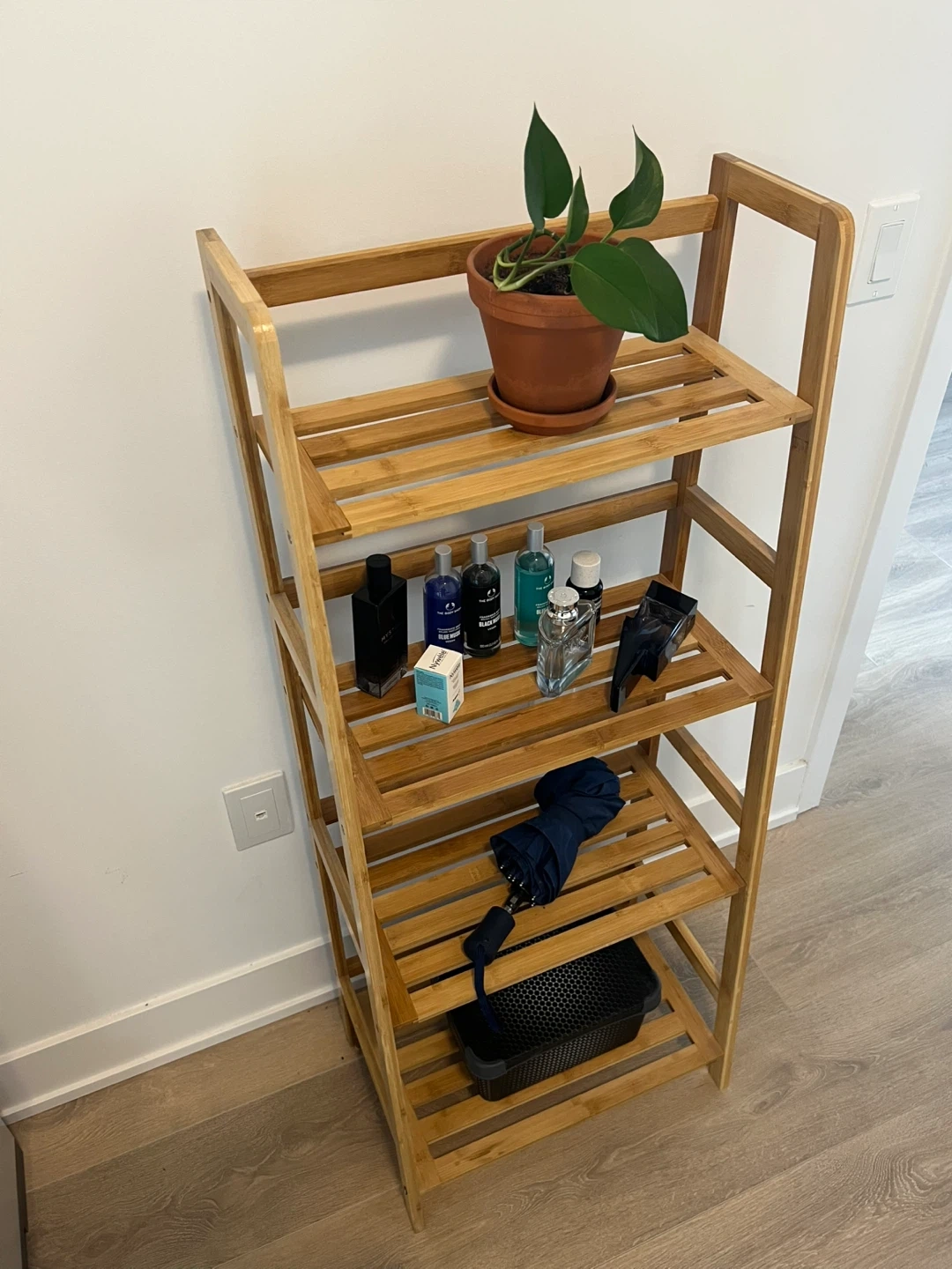 Selling a bamboo shelf rack, perfect for adding some extra storage space to your home! It's in great condition and ready to use. Great for organizing toiletries, plants, or anything else you need to keep tidy