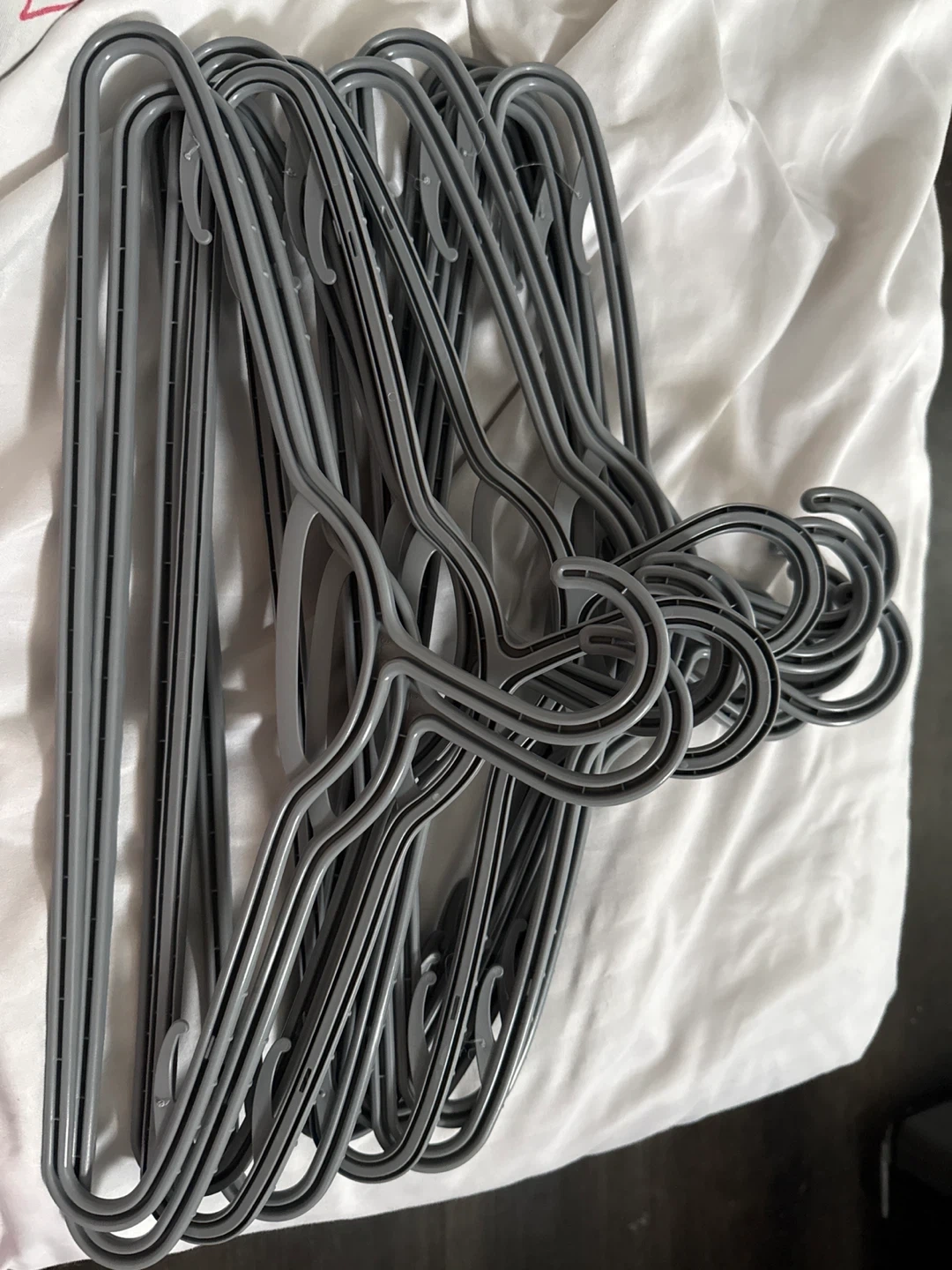 Selling a bundle (13 pieces) of grey plastic clothes hangers. They're in great shape and ready to help organize your closet!
