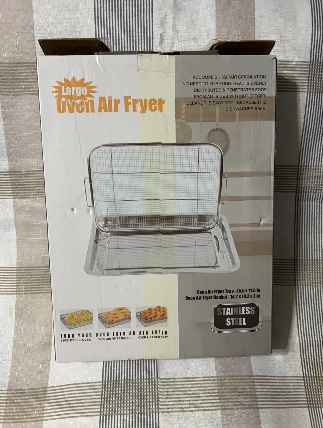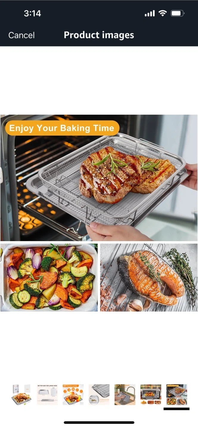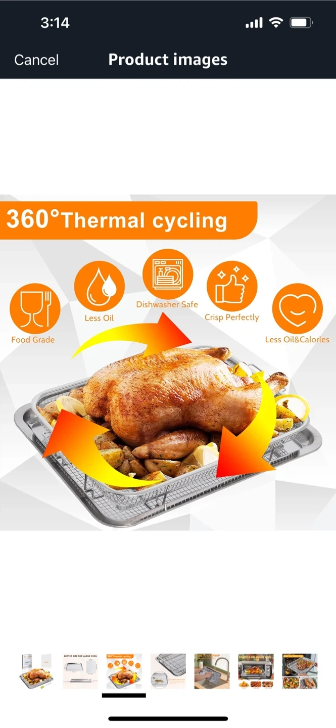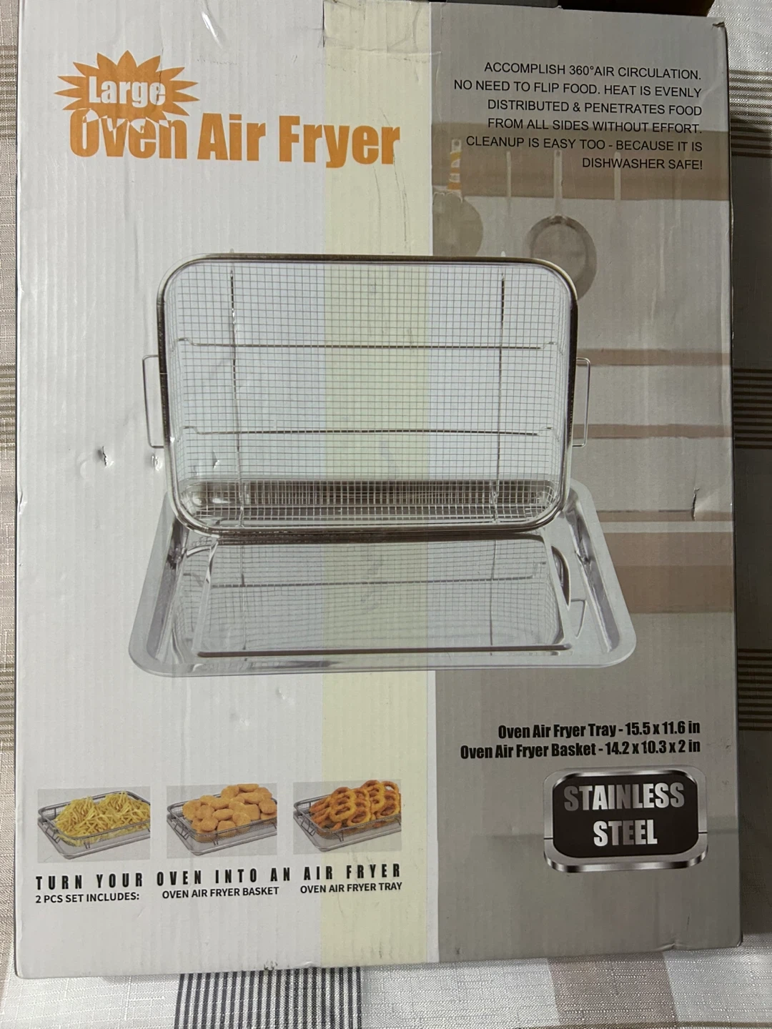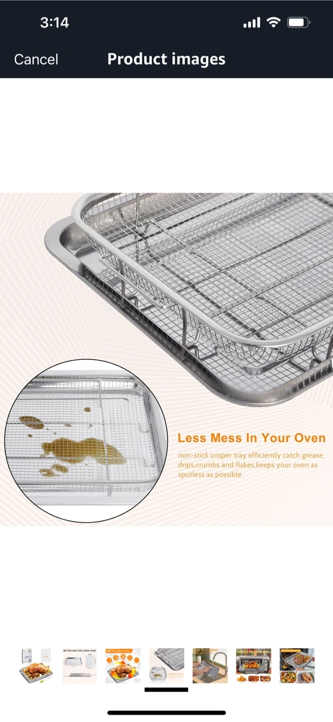 Get ready to enjoy your baking time with this stainless steel oven baking pan and crisper basket! It's designed to make meals crispy and delicious with less oil, thanks to its 360° thermal cycling. Plus, it's dishwasher safe for easy cleanup! The set is food grade and helps reduce oil and calories in your cooking. Dimensions are 38cm/15.6x in x 28cm/11.6in.