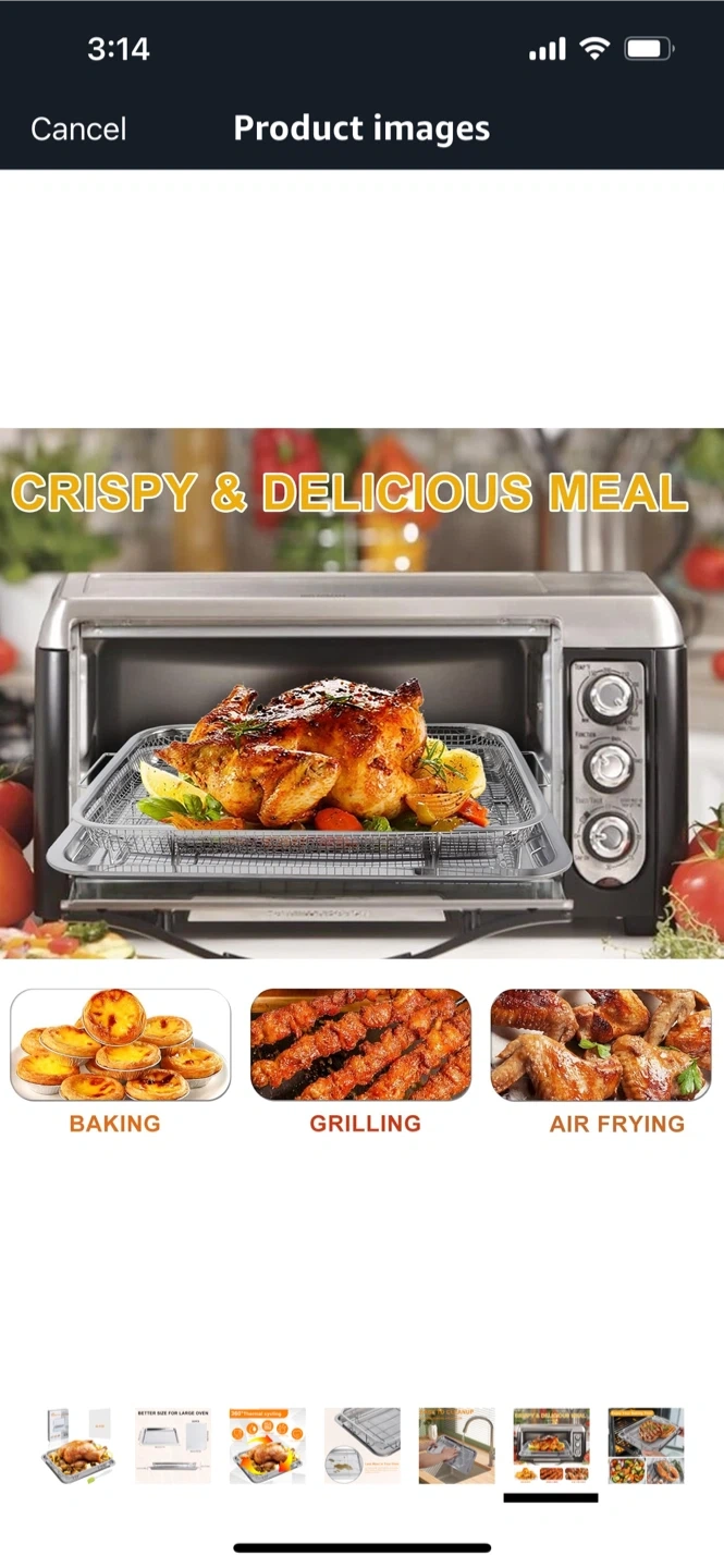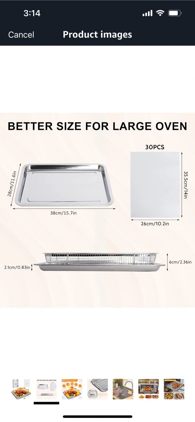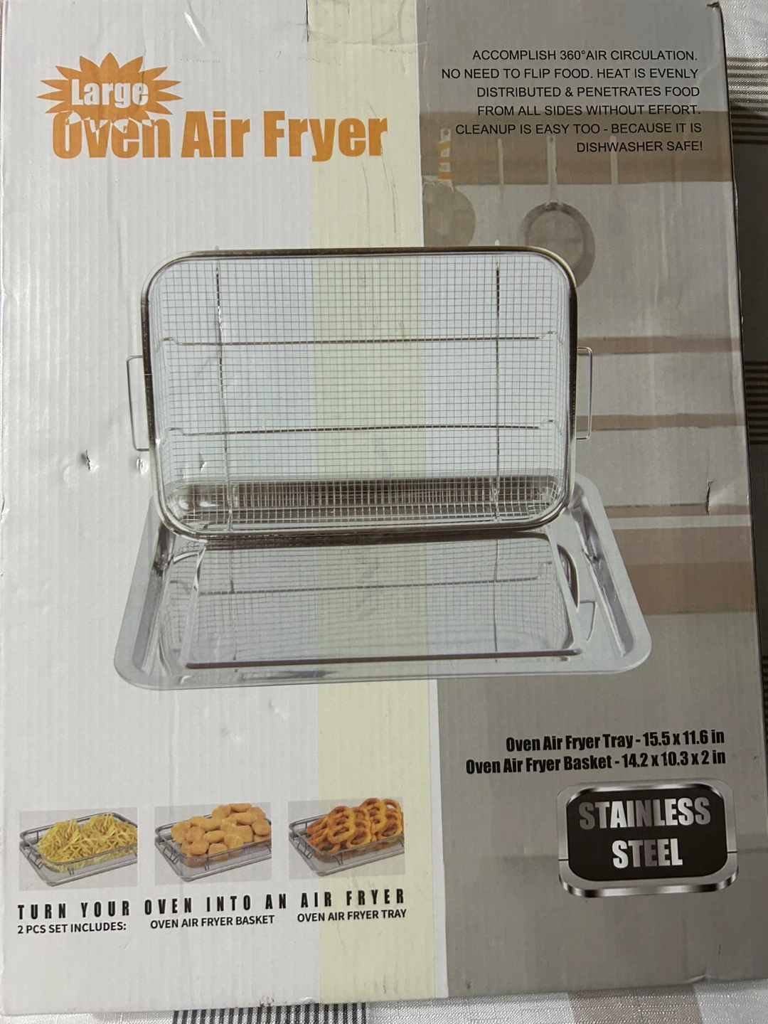 Get ready to enjoy your baking time with this stainless steel oven baking pan and crisper basket! It's designed to make meals crispy and delicious with less oil, thanks to its 360° thermal cycling. Plus, it's dishwasher safe for easy cleanup! The set is food grade and helps reduce oil and calories in your cooking. Dimensions are 38cm/15.6x in x 28cm/11.6in.