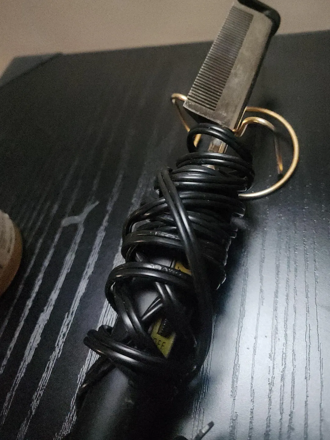 Selling a used Pro-Tools EHC 0390 hot comb. It has settings for low, medium, and high. Adjustable using the dial on the sides, which rotates the dial visible on the front of the handle. Heats up quickly. Flexible protective black rubber topper on comb to minimize burns during use. Some signs of use are visible. Works like new.
