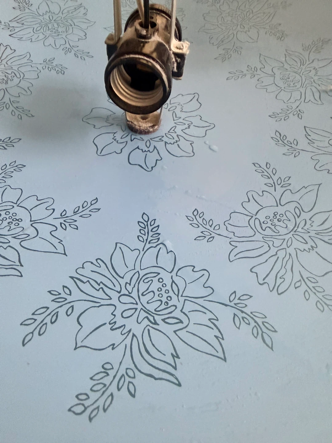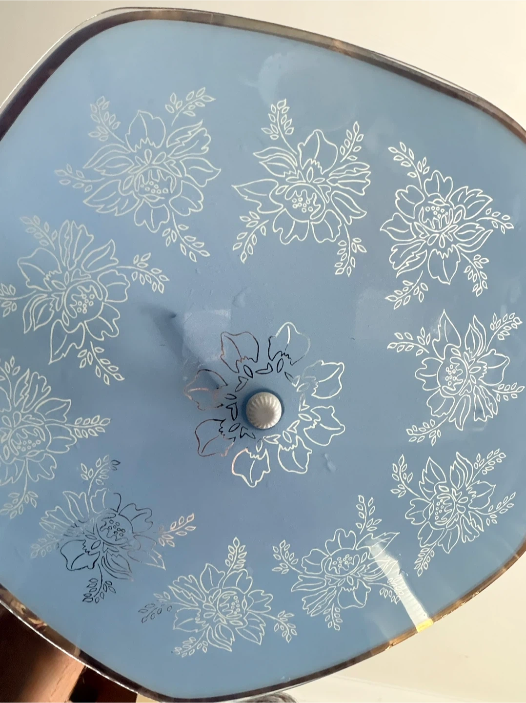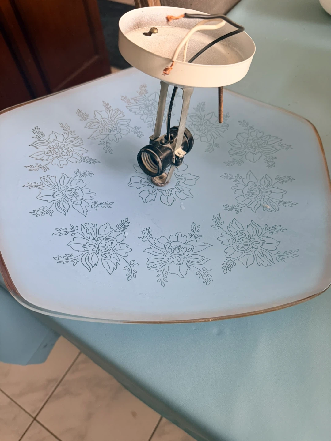 Selling a vintage ceiling light fixture with a lovely floral pattern on a light blue background. It's a unique piece that could add a touch of retro charm to any room. The fixture appears to be in good condition and is ready to be installed