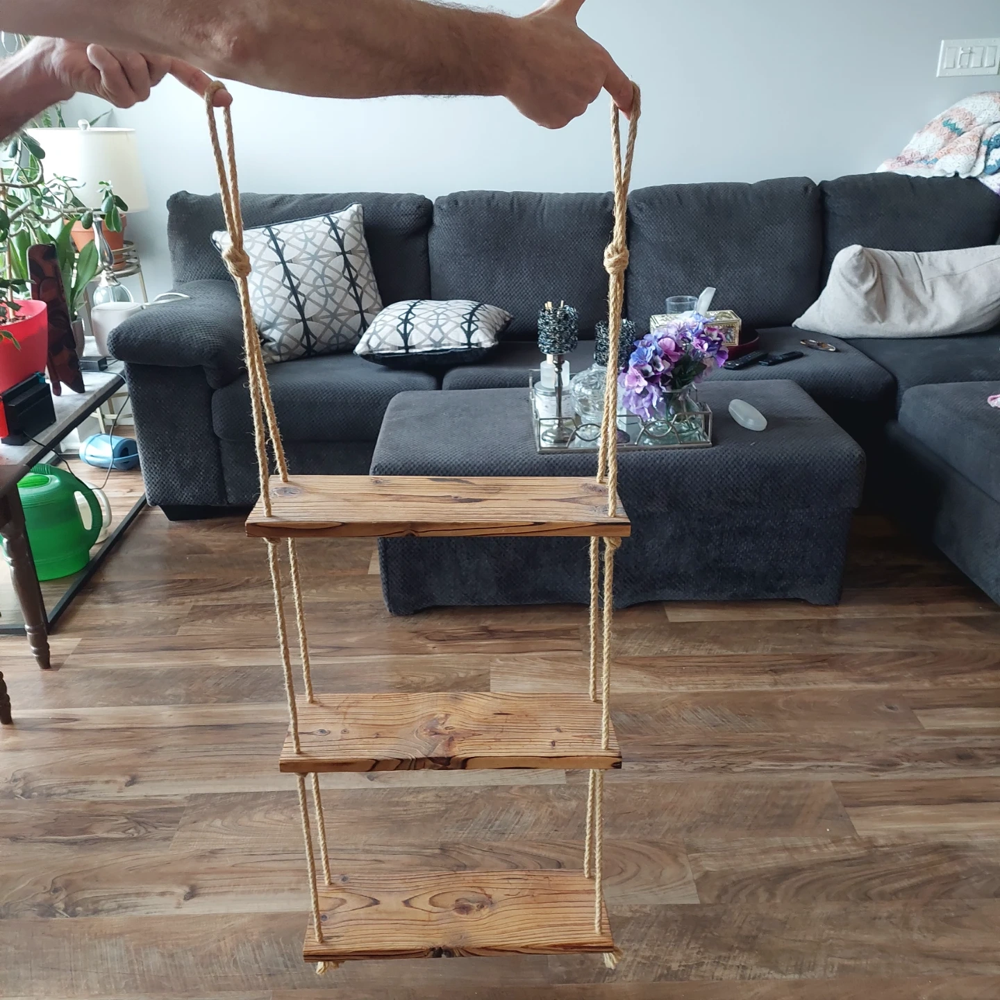 Add a touch of rustic charm to your home with this wooden hanging rope shelf! It features three tiers of sturdy wooden planks suspended by durable rope. Perfect for displaying plants, photos, or other decorative items. It's in great condition and ready to bring a unique touch to any room