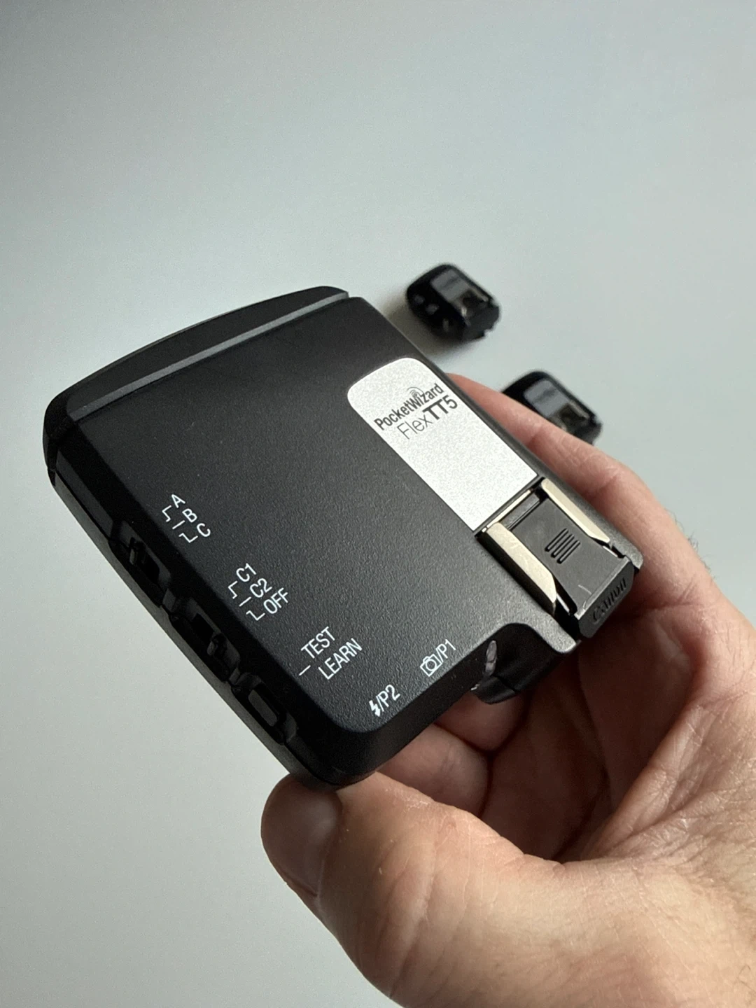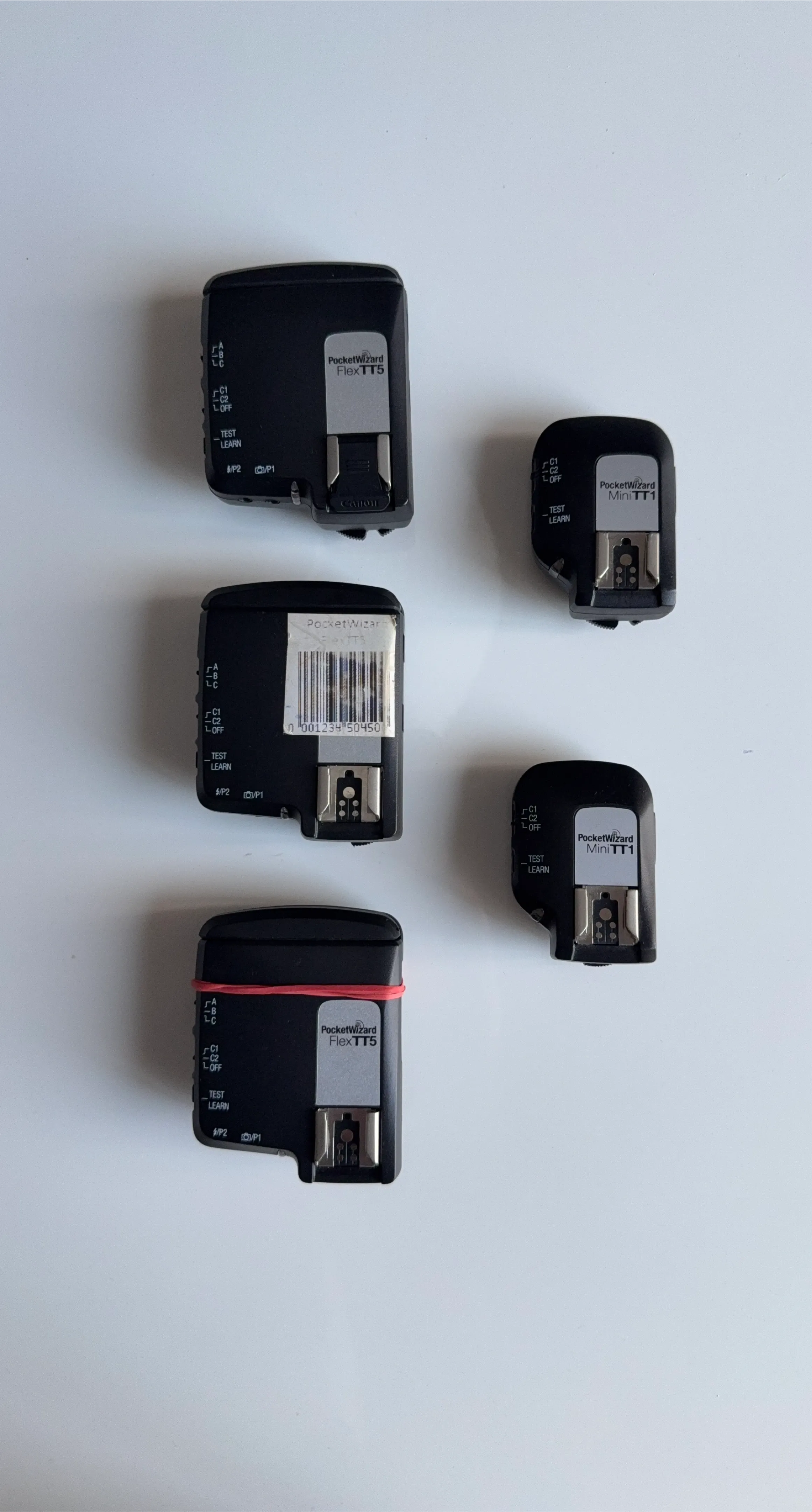 Selling a PocketWizard FlexTT5 (x3) and MiniTT1 (x2) set. These are great for off-camera flash photography. They're in good condition and ready to use. One TT5 has a broken battery cover, but works perfectly fine with elastic lol.