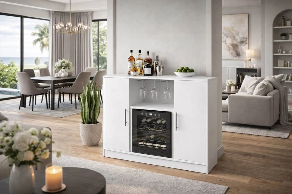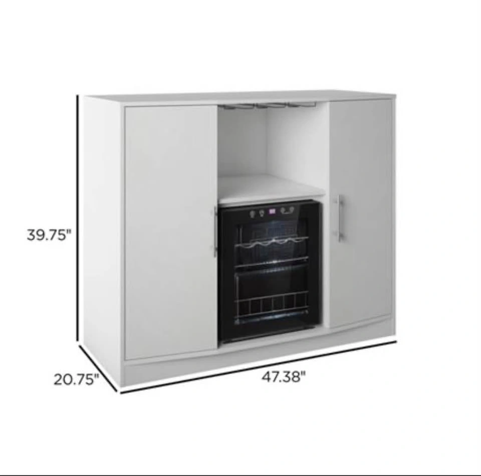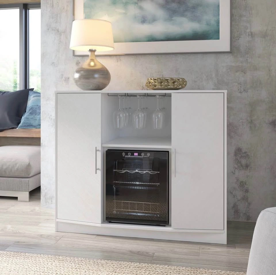 Brand new modern bar cabinet with refrigerated wine cooler and glass storage. Clean white finish, perfect for a house, condo, basement, or entertainment space.