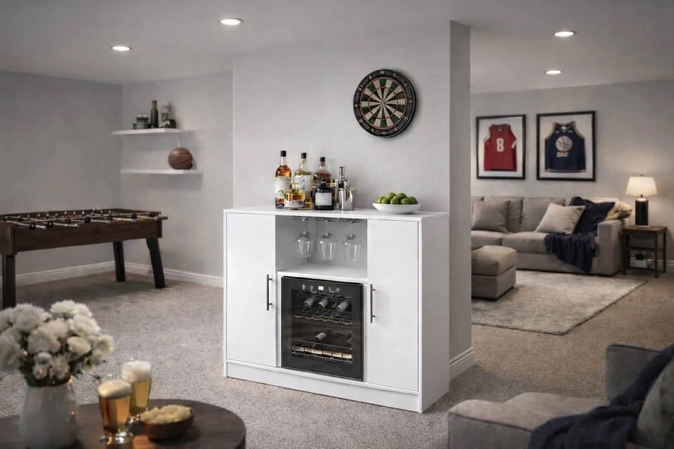 Brand new modern bar cabinet with refrigerated wine cooler and glass storage. Clean white finish, perfect for a house, condo, basement, or entertainment space.