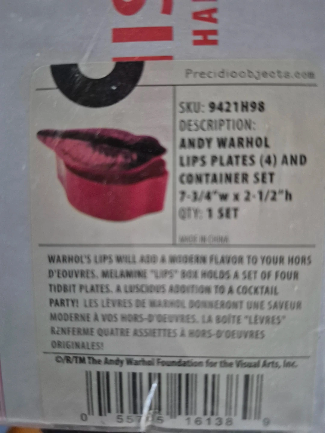 Selling a brand new Andy Warhol Lips Plates (4) and container set! This set includes four tidbit plates and a container. The plates are made of melamine and the box indicates the size as 7-3/4"w x 2-1/2"h. Warhol's lips will add a modern flavour to your hors d'oeuvres!