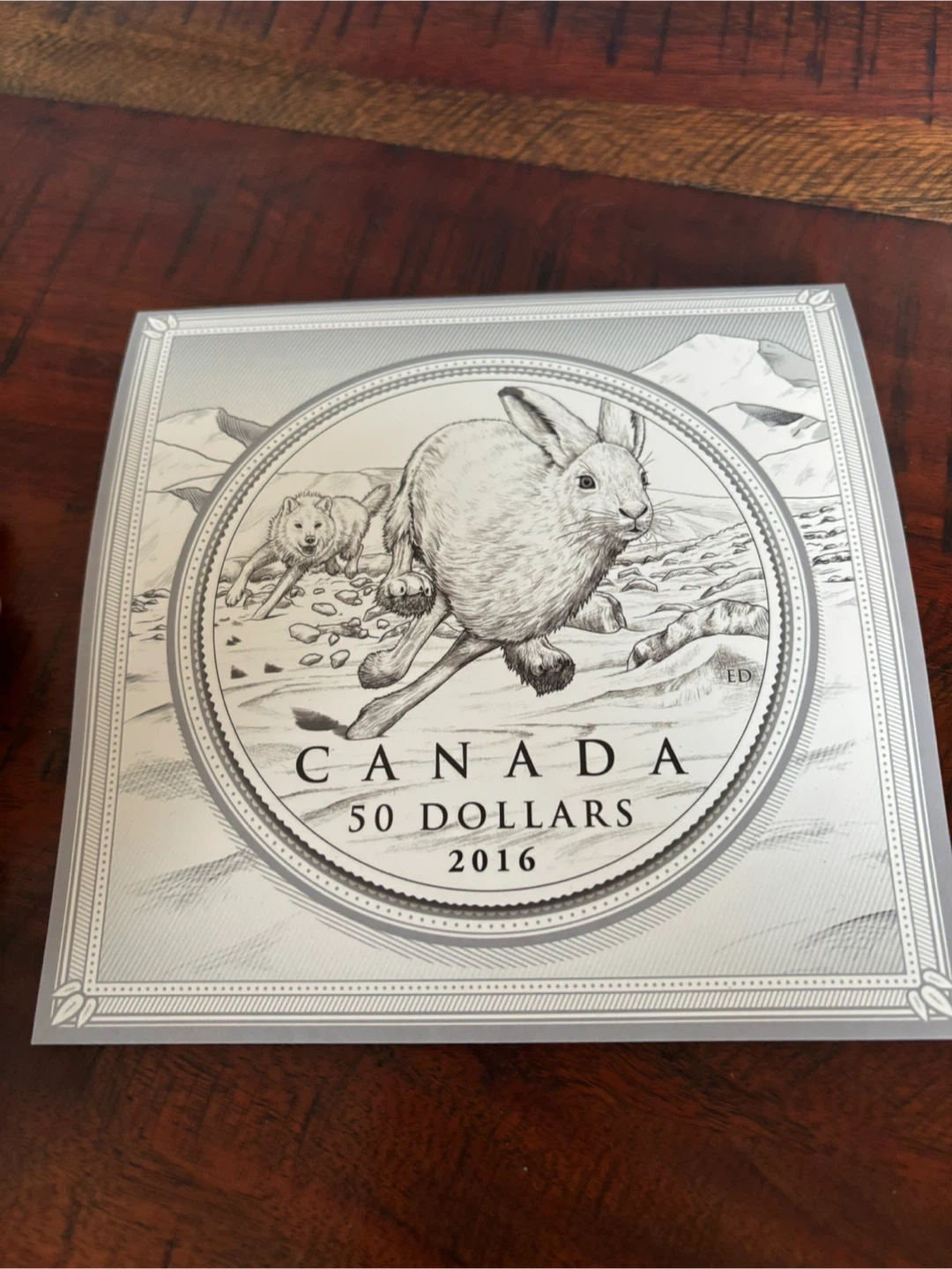 Selling a Royal Canadian Mint $50 coin from 2016. It's a silver coin with a matte proof finish. The design features a running hare and wolf. A great addition to any coin collection!
