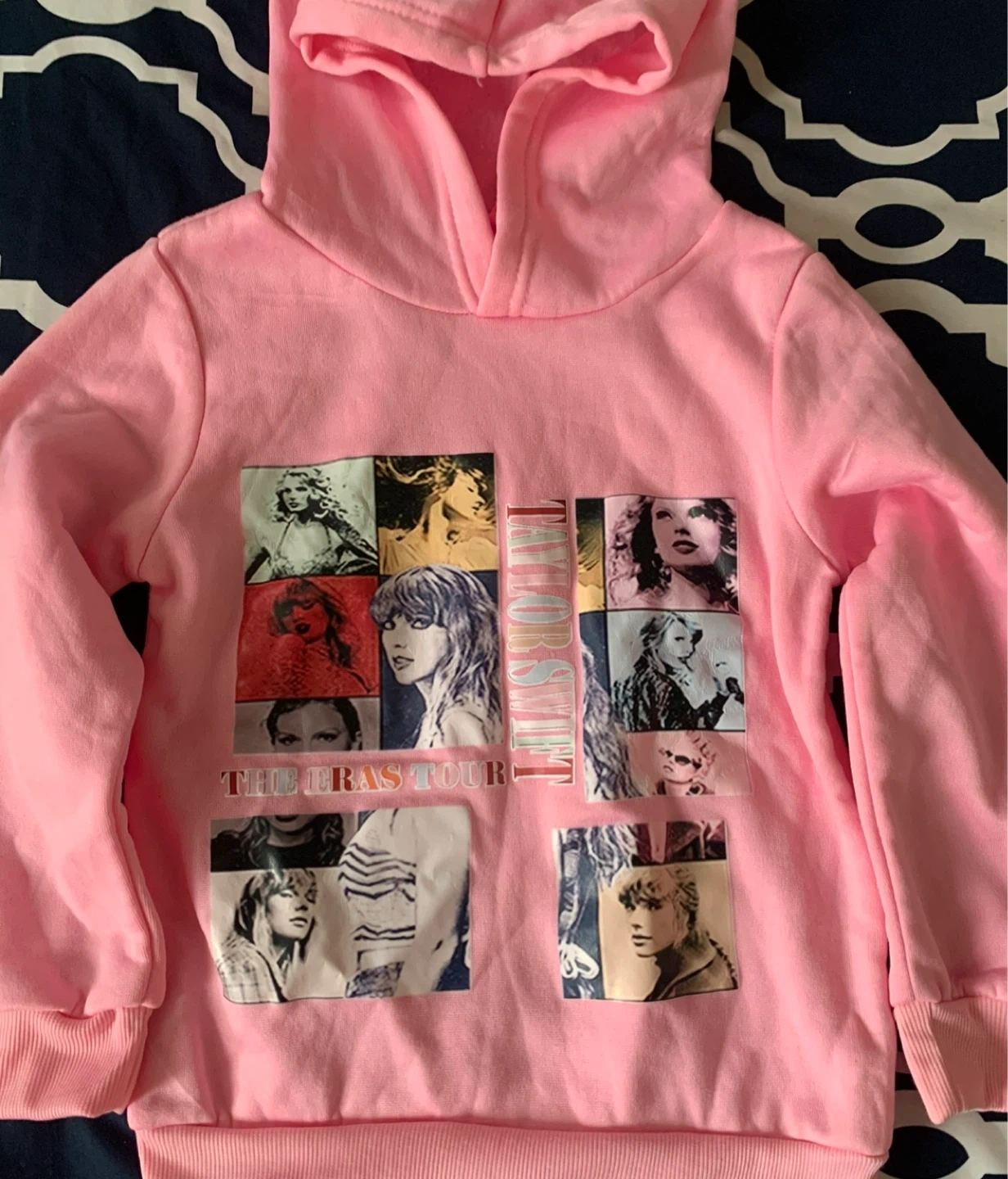 Selling a cute pink Taylor Swift Eras Tour hoodie! It’s a size 120 and features a collage of images from the tour. Perfect for any young Swiftie!
