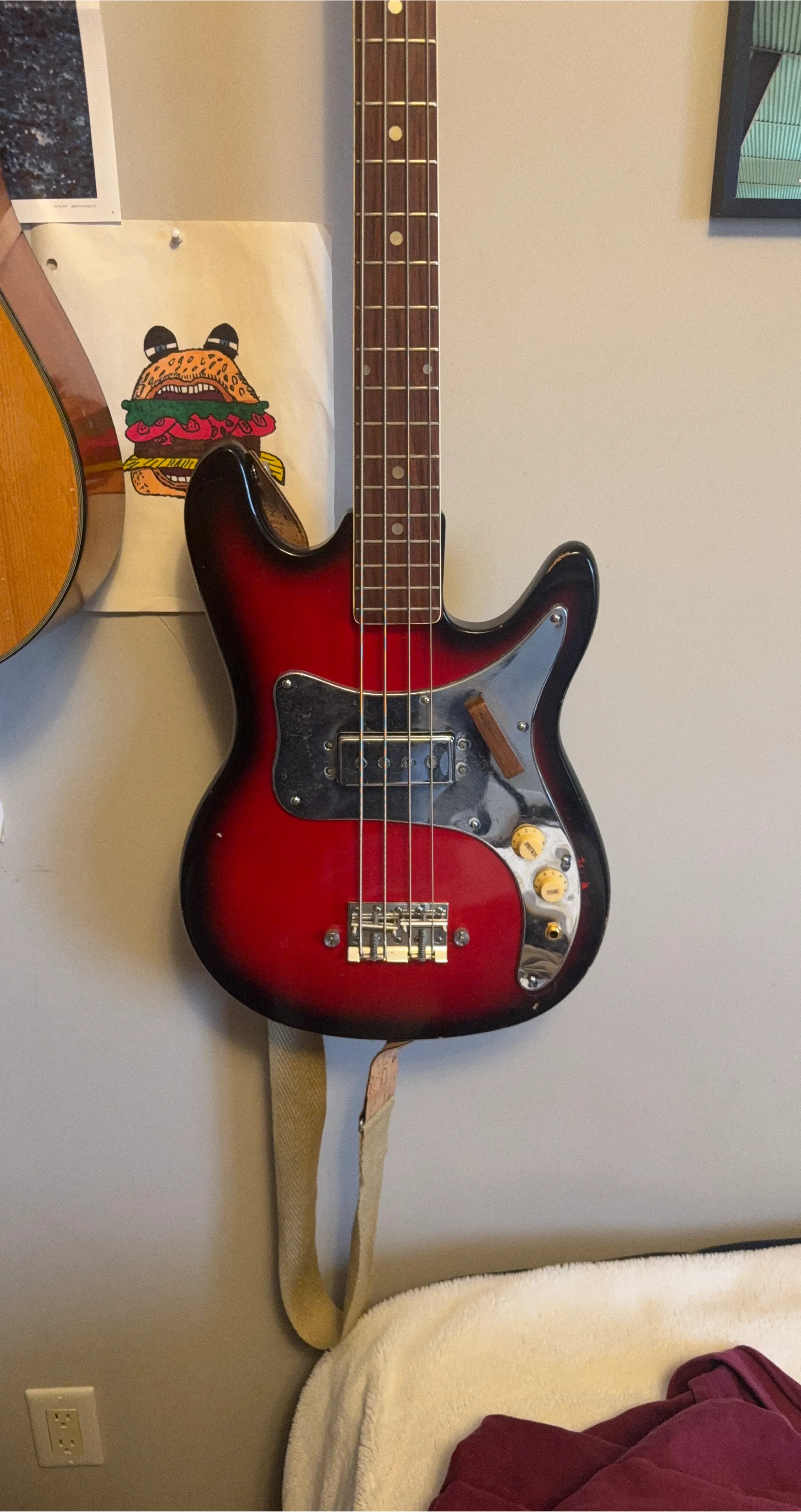 Selling a vintage electric bass guitar in red. It has a unique look and would be great for someone looking for a vintage instrument. It shows some signs of wear but is still in good working condition. Bought it in non working condition and got it repaired at a local shop so it sounds great now. Great vintage bass that I’ve seen on eBay for $350 CAD.