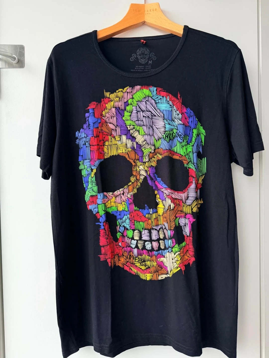 !Ay Güey! Black T-Shirt with Multicolor Skull Design - Size M