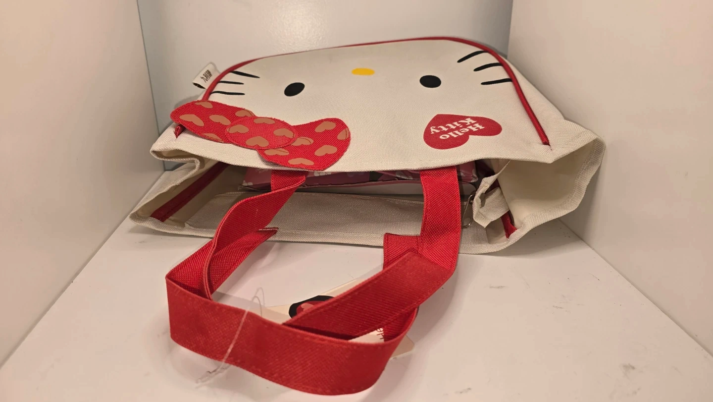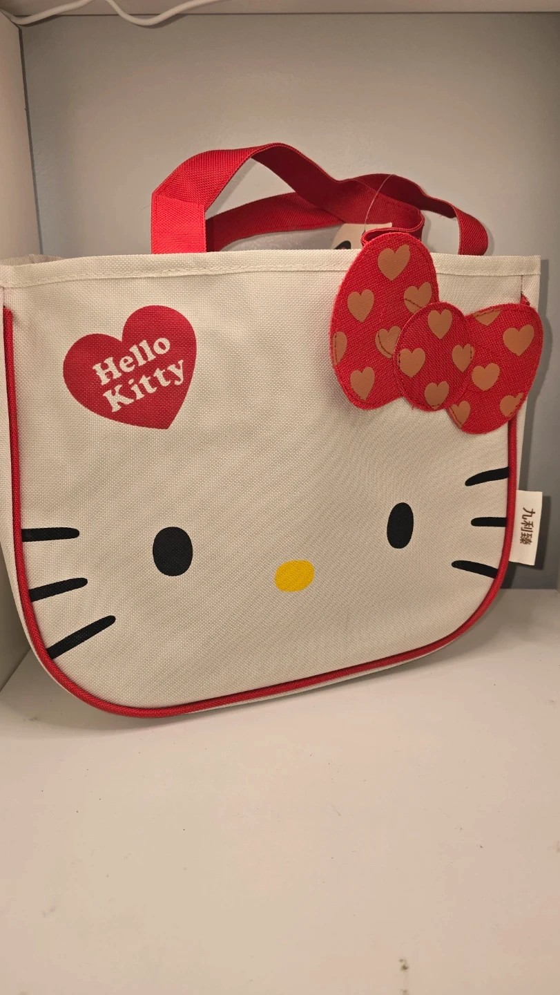 Super cute Hello Kitty tote bag! Perfect for carrying your everyday essentials with a touch of kawaii style. The bag features a charming Hello Kitty design with a red trim and handles. It's a fun and practical accessory for any Hello Kitty fan